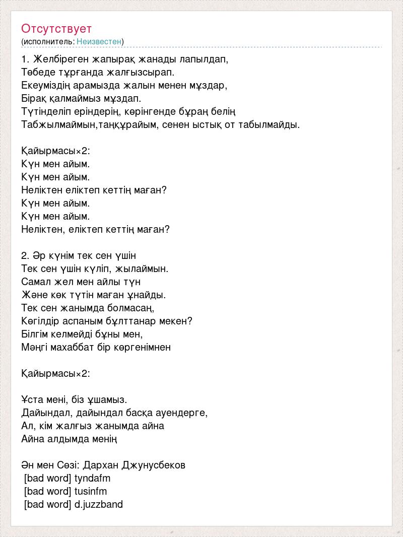 1. Желбіреген жапырақ жанады лапылдап, Төбеде тұрғанда жалғызсырап. Екеуміздің арамызда жалын менен мұздар, Бірақ қалмаймыз мұздап. Түтінделіп еріндерің, көрінгенде бұраң белің Табжылмаймын,таңқұрайым, сенен ыстық от табылмайды. Қайырмасы×2: Күн мен айым. Күн мен айым. Неліктен еліктеп кеттің маған? Күн мен айым. Күн мен айым. Неліктен, еліктеп кеттің маған? 2. Әр күнім тек сен үшін Тек сен үшін күліп, жылаймын. Самал жел мен айлы түн Және көк түтін маған ұнайды. Тек сен жанымда болмасаң, Көгілдір аспаным бұлттанар мекен? Білгім келмейді бұны мен, Мәңгі махаббат бір көргенімнен Қайырмасы×2: Ұста мені, біз ұшамыз. Дайындал, дайындал басқа ауендерге, Ал, кім жалғыз жанымда айна Айна алдымда менің Ән мен Сөзі: Дархан Джунусбеков [bad word] tyndafm [bad word] tusinfm [bad word] d.juzzband