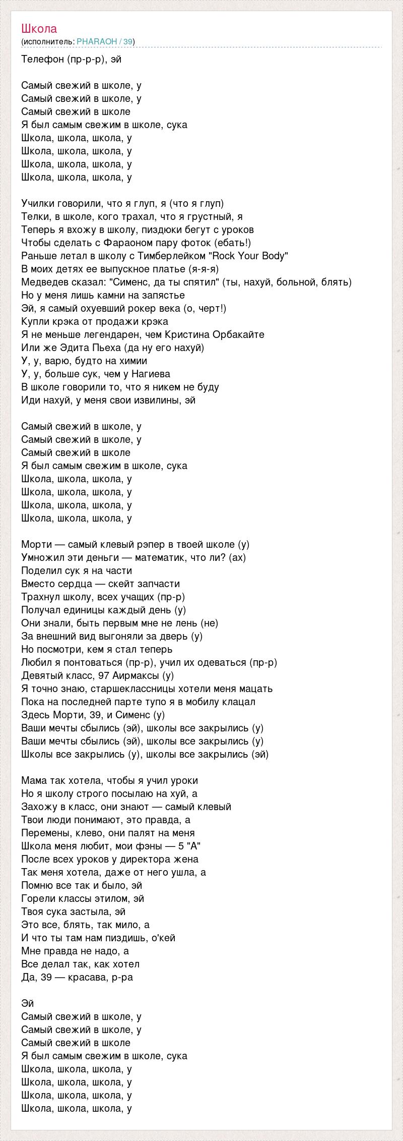 Телефон (пр-р-р), эй Самый свежий в школе, у Самый свежий в школе, у Самый свежий в школе Я был самым свежим в школе, сука Школа, школа, школа, у Школа, школа, школа, у Школа, школа, школа, у Школа, школа, школа, у Училки говорили, что я глуп, я (что я глуп) Телки, в школе, кого трахал, что я грустный, я Теперь я вхожу в школу, пиздюки бегут с уроков Чтобы сделать с Фараоном пару фоток (ебать!) Раньше летал в школу с Тимберлейком "Rock Your Body" В моих детях ее выпускное платье (я-я-я) Медведев сказал: "Сименс, да ты спятил" (ты, нахуй, больной, блять) Но у меня лишь камни на запястье Эй, я самый охуевший рокер века (о, черт!) Купли крэка от продажи крэка Я не меньше легендарен, чем Кристина Орбакайте Или же Эдита Пьеха (да ну его нахуй) У, у, варю, будто на химии У, у, больше сук, чем у Нагиева В школе говорили то, что я никем не буду Иди нахуй, у меня свои извилины, эй Самый свежий в школе, у Самый свежий в школе, у Самый свежий в школе Я был самым свежим в школе, сука Школа, школа, школа, у Школа, школа, школа, у Школа, школа, школа, у Школа, школа, школа, у Морти — самый клевый рэпер в твоей школе (у) Умножил эти деньги — математик, что ли? (ах) Поделил сук я на части Вместо сердца — скейт запчасти Трахнул школу, всех учащих (пр-р) Получал единицы каждый день (у) Они знали, быть первым мне не лень (не) За внешний вид выгоняли за дверь (у) Но посмотри, кем я стал теперь Любил я понтоваться (пр-р), учил их одеваться (пр-р) Девятый класс, 97 Аирмаксы (у) Я точно знаю, старшеклассницы хотели меня мацать Пока на последней парте тупо я в мобилу клацал Здесь Морти, 39, и Сименс (у) Ваши мечты сбылись (эй), школы все закрылись (у) Ваши мечты сбылись (эй), школы все закрылись (у) Школы все закрылись (у), школы все закрылись (эй) Мама так хотела, чтобы я учил уроки Но я школу строго посылаю на хуй, а Захожу в класс, они знают — самый клевый Твои люди понимают, это правда, а Перемены, клево, они палят на меня Школа меня любит, мои фэны — 5 "А" После всех уроков у директора жена Так меня хотела, даже от него ушла, а Помню все так и было, эй Горели классы этилом, эй Твоя сука застыла, эй Это все, блять, так мило, а И что ты там нам пиздишь, о'кей Мне правда не надо, а Все делал так, как хотел Да, 39 — красава, р-ра Эй Самый свежий в школе, у Самый свежий в школе, у Самый свежий в школе Я был самым свежим в школе, сука Школа, школа, школа, у Школа, школа, школа, у Школа, школа, школа, у Школа, школа, школа, у