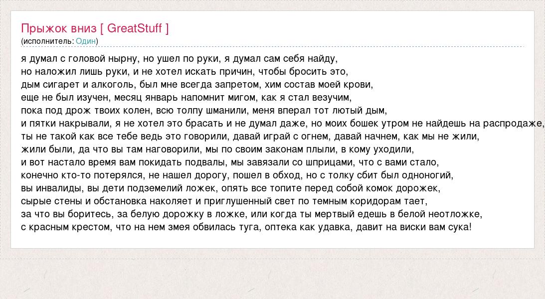 я думал с головой нырну, но ушел по руки, я думал сам себя найду, но наложил лишь руки, и не хотел искать причин, чтобы бросить это, дым сигарет и алкоголь, был мне всегда запретом, хим состав моей крови, еще не был изучен, месяц январь напомнит мигом, как я стал везучим, пока под дрож твоих колен, всю толпу шманили, меня вперал тот лютый дым, и пятки накрывали, я не хотел это брасать и не думал даже, но моих бошек утром не найдешь на распродаже, ты не такой как все тебе ведь это говорили, давай играй с огнем, давай начнем, как мы не жили, жили были, да что вы там наговорили, мы по своим законам плыли, в кому уходили, и вот настало время вам покидать подвалы, мы завязали со шприцами, что с вами стало, конечно кто-то потерялся, не нашел дорогу, пошел в обход, но с толку сбит был одноногий, вы инвалиды, вы дети подземелий ложек, опять все топите перед собой комок дорожек, сырые стены и обстановка наколяет и приглушенный свет по темным коридорам тает, за что вы боритесь, за белую дорожку в ложке, или когда ты мертвый едешь в белой неотложке, с красным крестом, что на нем змея обвилась туга, оптека как удавка, давит на виски вам сука!