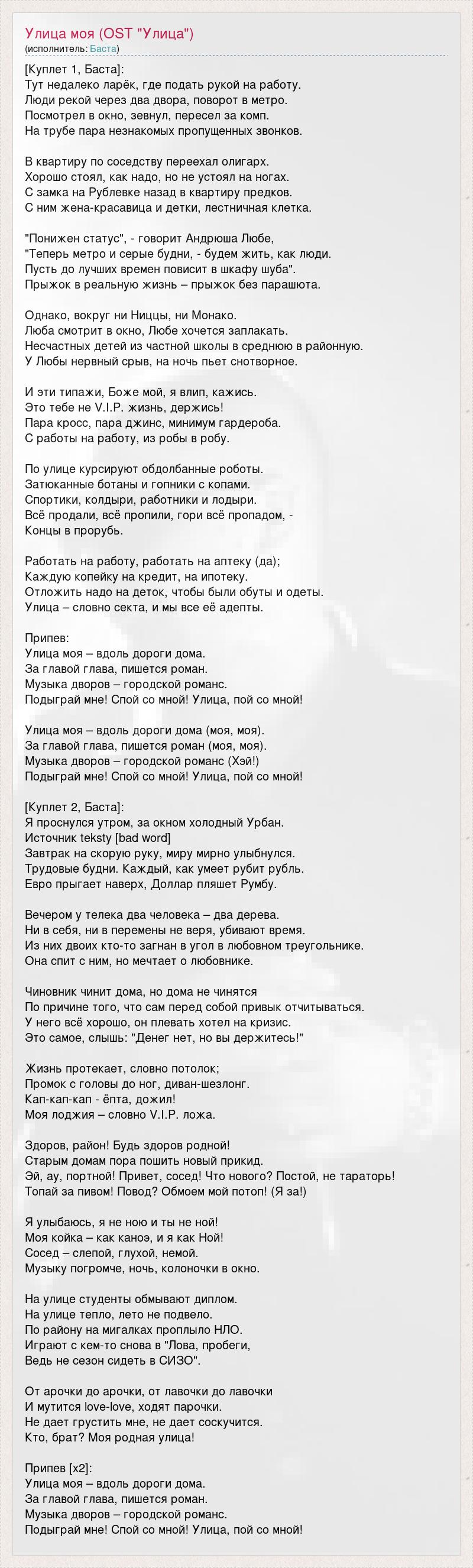 [Куплет 1, Баста]: Тут недалеко ларёк, где подать рукой на работу. Люди рекой через два двора, поворот в метро. Посмотрел в окно, зевнул, пересел за комп. На трубе пара незнакомых пропущенных звонков. В квартиру по соседству переехал олигарх. Хорошо стоял, как надо, но не устоял на ногах. С замка на Рублевке назад в квартиру предков. С ним жена-красавица и детки, лестничная клетка. "Понижен статус", - говорит Андрюша Любе, "Теперь метро и серые будни, - будем жить, как люди. Пусть до лучших времен повисит в шкафу шуба". Прыжок в реальную жизнь – прыжок без парашюта. Однако, вокруг ни Ниццы, ни Монако. Люба смотрит в окно, Любе хочется заплакать. Несчастных детей из частной школы в среднюю в районную. У Любы нервный срыв, на ночь пьет снотворное. И эти типажи, Боже мой, я влип, кажись. Это тебе не V.I.P. жизнь, держись! Пара кросс, пара джинс, минимум гардероба. С работы на работу, из робы в робу. По улице курсируют обдолбанные роботы. Затюканные ботаны и гопники с копами. Спортики, колдыри, работники и лодыри. Всё продали, всё пропили, гори всё пропадом, - Концы в прорубь. Работать на работу, работать на аптеку (да); Каждую копейку на кредит, на ипотеку. Отложить надо на деток, чтобы были обуты и одеты. Улица – словно секта, и мы все её адепты. Припев: Улица моя – вдоль дороги дома. За главой глава, пишется роман. Музыка дворов – городской романс. Подыграй мне! Спой со мной! Улица, пой со мной! Улица моя – вдоль дороги дома (моя, моя). За главой глава, пишется роман (моя, моя). Музыка дворов – городской романс (Хэй!) Подыграй мне! Спой со мной! Улица, пой со мной! [Куплет 2, Баста]: Я проснулся утром, за окном холодный Урбан. Источник teksty [bad word] Завтрак на скорую руку, миру мирно улыбнулся. Трудовые будни. Каждый, как умеет рубит рубль. Евро прыгает наверх, Доллар пляшет Румбу. Вечером у телека два человека – два дерева. Ни в себя, ни в перемены не веря, убивают время. Из них двоих кто-то загнан в угол в любовном треугольнике. Она спит с ним, но мечтает о любовнике. Чиновник чинит дома, но дома не чинятся По причине того, что сам перед собой привык отчитываться. У него всё хорошо, он плевать хотел на кризис. Это самое, слышь: "Денег нет, но вы держитесь!" Жизнь протекает, словно потолок; Промок с головы до ног, диван-шезлонг. Кап-кап-кап - ёпта, дожил! Моя лоджия – словно V.I.P. ложа. Здоров, район! Будь здоров родной! Старым домам пора пошить новый прикид. Эй, ау, портной! Привет, сосед! Что нового? Постой, не тараторь! Топай за пивом! Повод? Обмоем мой потоп! (Я за!) Я улыбаюсь, я не ною и ты не ной! Моя койка – как каноэ, и я как Ной! Сосед – слепой, глухой, немой. Музыку погромче, ночь, колоночки в окно. На улице студенты обмывают диплом. На улице тепло, лето не подвело. По району на мигалках проплыло НЛО. Играют с кем-то снова в "Лова, пробеги, Ведь не сезон сидеть в СИЗО". От арочки до арочки, от лавочки до лавочки И мутится love-love, ходят парочки. Не дает грустить мне, не дает соскучится. Кто, брат? Моя родная улица! Припев [x2]: Улица моя – вдоль дороги дома. За главой глава, пишется роман. Музыка дворов – городской романс. Подыграй мне! Спой со мной! Улица, пой со мной!