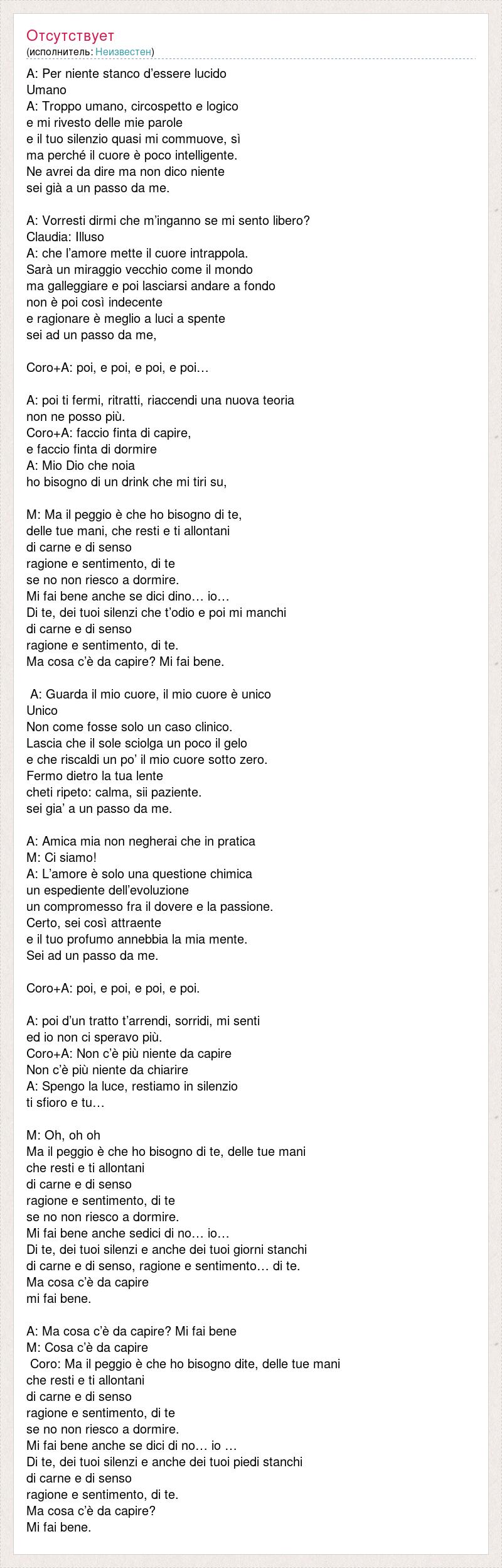 A: Per niente stanco d’essere lucido Umano A: Troppo umano, circospetto e logico e mi rivesto delle mie parole e il tuo silenzio quasi mi commuove, sì ma perché il cuore è poco intelligente. Ne avrei da dire ma non dico niente sei già a un passo da me. A: Vorresti dirmi che m’inganno se mi sento libero? Claudia: Illuso A: che l’amore mette il cuore intrappola. Sarà un miraggio vecchio come il mondo ma galleggiare e poi lasciarsi andare a fondo non è poi così indecente e ragionare è meglio a luci a spente sei ad un passo da me, Coro+A: poi, e poi, e poi, e poi… A: poi ti fermi, ritratti, riaccendi una nuova teoria non ne posso più. Coro+A: faccio finta di capire, e faccio finta di dormire A: Mio Dio che noia ho bisogno di un drink che mi tiri su, M: Ma il peggio è che ho bisogno di te, delle tue mani, che resti e ti allontani di carne e di senso ragione e sentimento, di te se no non riesco a dormire. Mi fai bene anche se dici dino… io… Di te, dei tuoi silenzi che t’odio e poi mi manchi di carne e di senso ragione e sentimento, di te. Ma cosa c’è da capire? Mi fai bene. A: Guarda il mio cuore, il mio cuore è unico Unico Non come fosse solo un caso clinico. Lascia che il sole sciolga un poco il gelo e che riscaldi un po’ il mio cuore sotto zero. Fermo dietro la tua lente cheti ripeto: calma, sii paziente. sei gia’ a un passo da me. A: Amica mia non negherai che in pratica M: Ci siamo! A: L’amore è solo una questione chimica un espediente dell’evoluzione un compromesso fra il dovere e la passione. Certo, sei così attraente e il tuo profumo annebbia la mia mente. Sei ad un passo da me. Coro+A: poi, e poi, e poi, e poi. A: poi d’un tratto t’arrendi, sorridi, mi senti ed io non ci speravo più. Coro+A: Non c’è più niente da capire Non c’è più niente da chiarire A: Spengo la luce, restiamo in silenzio ti sfioro e tu… M: Oh, oh oh Ma il peggio è che ho bisogno di te, delle tue mani che resti e ti allontani di carne e di senso ragione e sentimento, di te se no non riesco a dormire. Mi fai bene anche sedici di no… io… Di te, dei tuoi silenzi e anche dei tuoi giorni stanchi di carne e di senso, ragione e sentimento… di te. Ma cosa c’è da capire mi fai bene. A: Ma cosa c’è da capire? Mi fai bene M: Cosa c’è da capire Coro: Ma il peggio è che ho bisogno dite, delle tue mani che resti e ti allontani di carne e di senso ragione e sentimento, di te se no non riesco a dormire. Mi fai bene anche se dici di no… io … Di te, dei tuoi silenzi e anche dei tuoi piedi stanchi di carne e di senso ragione e sentimento, di te. Ma cosa c’è da capire? Mi fai bene.