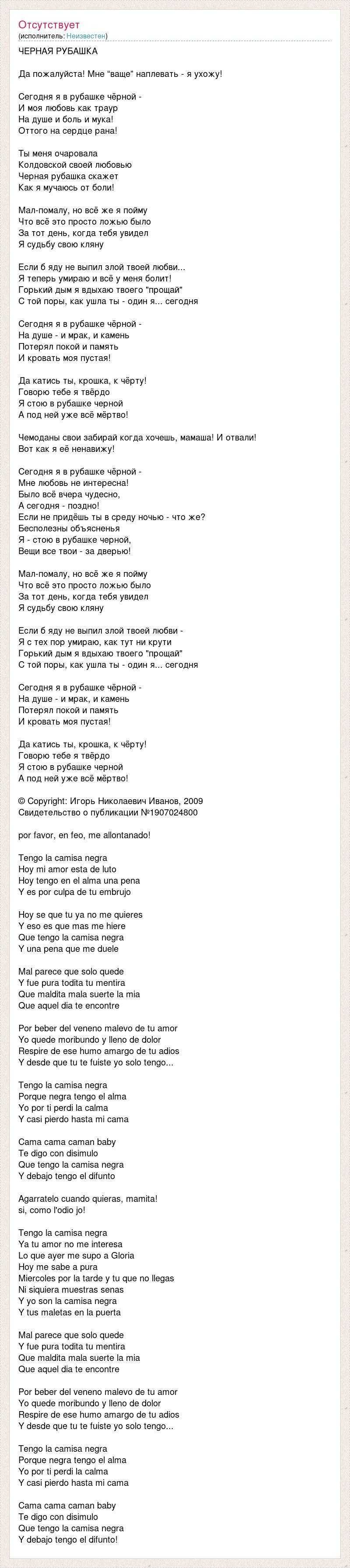 ЧЕРНАЯ РУБАШКА Да пожалуйста! Мне “ваще” наплевать - я ухожу! Сегодня я в рубашке чёрной - И моя любовь как траур На душе и боль и мука! Оттого на сердце рана! Ты меня очаровала Колдовской своей любовью Черная рубашка скажет Как я мучаюсь от боли! Мал-помалу, но всё же я пойму Что всё это просто ложью было За тот день, когда тебя увидел Я судьбу свою кляну Если б яду не выпил злой твоей любви... Я теперь умираю и всё у меня болит! Горький дым я вдыхаю твоего "прощай" С той поры, как ушла ты - один я... сегодня Сегодня я в рубашке чёрной - На душе - и мрак, и камень Потерял покой и память И кровать моя пустая! Да катись ты, крошка, к чёрту! Говорю тебе я твёрдо Я стою в рубашке черной А под ней уже всё мёртво! Чемоданы свои забирай когда хочешь, мамаша! И отвали! Вот как я её ненавижу! Сегодня я в рубашке чёрной - Мне любовь не интересна! Было всё вчера чудесно, А сегодня - поздно! Если не придёшь ты в среду ночью - что же? Бесполезны объясненья Я - стою в рубашке черной, Вещи все твои - за дверью! Мал-помалу, но всё же я пойму Что всё это просто ложью было За тот день, когда тебя увидел Я судьбу свою кляну Если б яду не выпил злой твоей любви - Я с тех пор умираю, как тут ни крути Горький дым я вдыхаю твоего "прощай" С той поры, как ушла ты - один я... сегодня Сегодня я в рубашке чёрной - На душе - и мрак, и камень Потерял покой и память И кровать моя пустая! Да катись ты, крошка, к чёрту! Говорю тебе я твёрдо Я стою в рубашке черной А под ней уже всё мёртво! © Copyright: Игорь Николаевич Иванов, 2009 Свидетельство о публикации №1907024800 por favor, en feo, me allontanado! Tengo la camisa negra Hoy mi amor esta de luto Hoy tengo en el alma una pena Y es por culpa de tu embrujo Hoy se que tu ya no me quieres Y eso es que mas me hiere Que tengo la camisa negra Y una pena que me duele Mal parece que solo quede Y fue pura todita tu mentira Que maldita mala suerte la mia Que aquel dia te encontre Por beber del veneno malevo de tu amor Yo quede moribundo y lleno de dolor Respire de ese humo amargo de tu adios Y desde que tu te fuiste yo solo tengo... Tengo la camisa negra Porque negra tengo el alma Yo por ti perdi la calma Y casi pierdo hasta mi cama Cama cama caman baby Te digo con disimulo Que tengo la camisa negra Y debajo tengo el difunto Agarratelo cuando quieras, mamita! si, como l'odio jo! Tengo la camisa negra Ya tu amor no me interesa Lo que ayer me supo a Gloria Hoy me sabe a pura Miercoles por la tarde y tu que no llegas Ni siquiera muestras senas Y yo son la camisa negra Y tus maletas en la puerta Mal parece que solo quede Y fue pura todita tu mentira Que maldita mala suerte la mia Que aquel dia te encontre Por beber del veneno malevo de tu amor Yo quede moribundo y lleno de dolor Respire de ese humo amargo de tu adios Y desde que tu te fuiste yo solo tengo... Tengo la camisa negra Porque negra tengo el alma Yo por ti perdi la calma Y casi pierdo hasta mi cama Cama cama caman baby Te digo con disimulo Que tengo la camisa negra Y debajo tengo el difunto!
