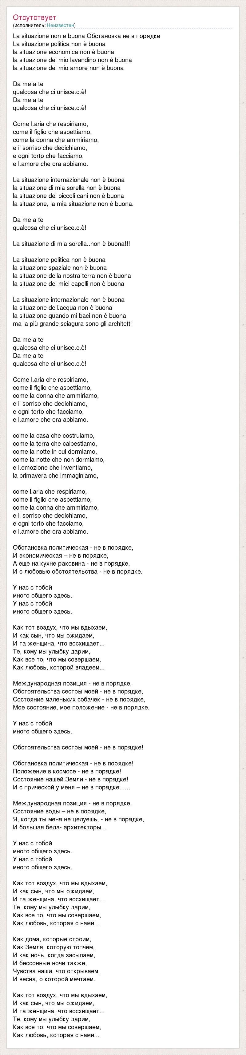 La situazione non e buona Обстановка не в порядке La situazione politica non è buona la situazione economica non è buona la situazione del mio lavandino non è buona la situazione del mio amore non è buona Da me a te qualcosa che ci unisce.c.è! Da me a te qualcosa che ci unisce.c.è! Come l.aria che respiriamo, come il figlio che aspettiamo, come la donna che ammiriamo, e il sorriso che dedichiamo, e ogni torto che facciamo, e l.amore che ora abbiamo. La situazione internazionale non è buona la situazione di mia sorella non è buona la situazione dei piccoli cani non è buona la situazione, la mia situazione non è buona. Da me a te qualcosa che ci unisce.c.è! La situazione di mia sorella..non è buona!!! La situazione politica non è buona la situazione spaziale non è buona la situazione della nostra terra non è buona la situazione dei miei capelli non è buona La situazione internazionale non è buona la situazione dell.acqua non è buona la situazione quando mi baci non è buona ma la più grande sciagura sono gli architetti Da me a te qualcosa che ci unisce.c.è! Da me a te qualcosa che ci unisce.c.è! Come l.aria che respiriamo, come il figlio che aspettiamo, come la donna che ammiriamo, e il sorriso che dedichiamo, e ogni torto che facciamo, e l.amore che ora abbiamo. come la casa che costruiamo, come la terra che calpestiamo, come la notte in cui dormiamo, come la notte che non dormiamo, e l.emozione che inventiamo, la primavera che immaginiamo, come l.aria che respiriamo, come il figlio che aspettiamo, come la donna che ammiriamo, e il sorriso che dedichiamo, e ogni torto che facciamo, e l.amore che ora abbiamo. Обстановка политическая - не в порядке, И экономическая – не в порядке, А еще на кухне раковина - не в порядке, И с любовью обстоятельства - не в порядке. У нас с тобой много общего здесь. У нас с тобой много общего здесь. Как тот воздух, что мы вдыхаем, И как сын, что мы ожидаем, И та женщина, что восхищает... Те, кому мы улыбку дарим, Как все то, что мы совершаем, Как любовь, которой владеем... Международная позиция - не в порядке, Обстоятельства сестры моей - не в порядке, Состояние маленьких собачек - не в порядке, Мое состояние, мое положение - не в порядке. У нас с тобой много общего здесь. Обстоятельства сестры моей - не в порядке! Обстановка политическая - не в порядке! Положение в космосе - не в порядке! Состояние нашей Земли - не в порядке! И с прической у меня – не в порядке...... Международная позиция - не в порядке, Состояние воды – не в порядке, Я, когда ты меня не целуешь, - не в порядке, И большая беда- архитекторы... У нас с тобой много общего здесь. У нас с тобой много общего здесь. Как тот воздух, что мы вдыхаем, И как сын, что мы ожидаем, И та женщина, что восхищает... Те, кому мы улыбку дарим, Как все то, что мы совершаем, Как любовь, которая с нами... Как дома, которые строим, Как Земля, которую топчем, И как ночь, когда засыпаем, И бессонные ночи также, Чувства наши, что открываем, И весна, о которой мечтаем. Как тот воздух, что мы вдыхаем, И как сын, что мы ожидаем, И та женщина, что восхищает... Те, кому мы улыбку дарим, Как все то, что мы совершаем, Как любовь, которая с нами...