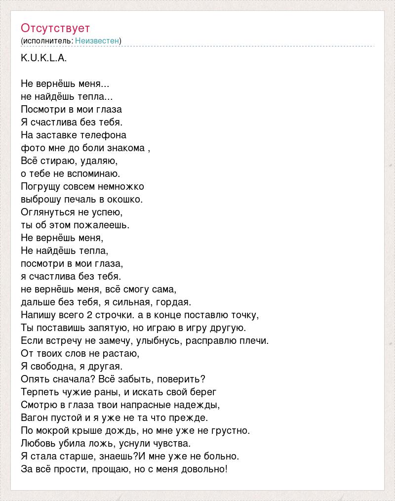 K.U.K.L.A. Не вернёшь меня... не найдёшь тепла... Посмотри в мои глаза Я счастлива без тебя. На заставке телефона фото мне до боли знакома , Всё стираю, удаляю, о тебе не вспоминаю. Погрущу совсем немножко выброшу печаль в окошко. Оглянуться не успею, ты об этом пожалеешь. Не вернёшь меня, Не найдёшь тепла, посмотри в мои глаза, я счастлива без тебя. не вернёшь меня, всё смогу сама, дальше без тебя, я сильная, гордая. Напишу всего 2 строчки. а в конце поставлю точку, Ты поставишь запятую, но играю в игру другую. Если встречу не замечу, улыбнусь, расправлю плечи. От твоих слов не растаю, Я свободна, я другая. Опять сначала? Всё забыть, поверить? Терпеть чужие раны, и искать свой берег Смотрю в глаза твои напрасные надежды, Вагон пустой и я уже не та что прежде. По мокрой крыше дождь, но мне уже не грустно. Любовь убила ложь, уснули чувства. Я стала старше, знаешь?И мне уже не больно. За всё прости, прощаю, но с меня довольно!