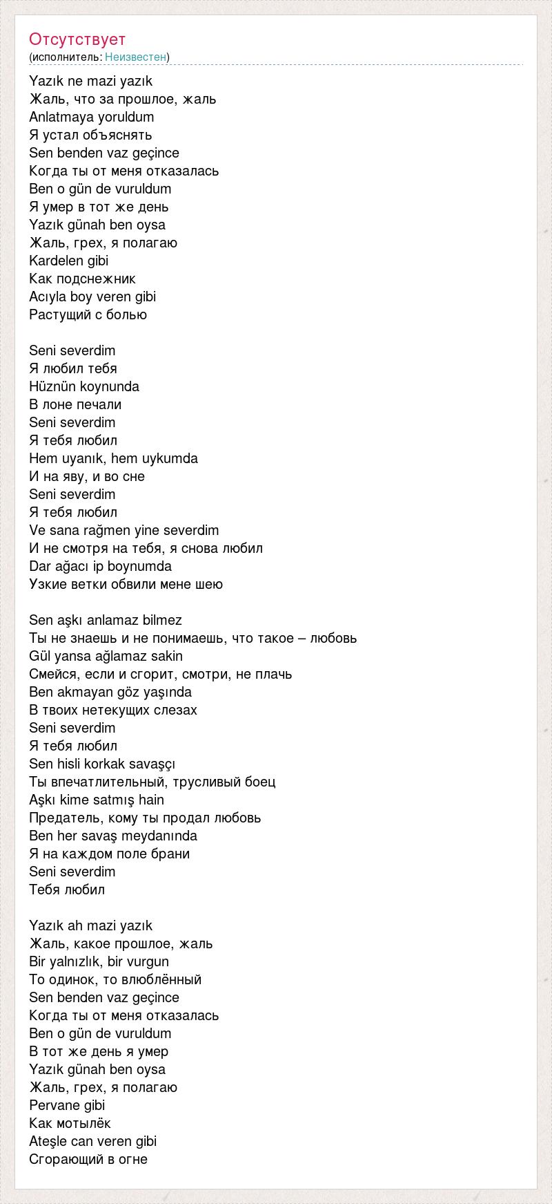 Yazık ne mazi yazık Жаль, что за прошлое, жаль Anlatmaya yoruldum Я устал объяснять Sen benden vaz geçince Когда ты от меня отказалась Ben o gün de vuruldum Я умер в тот же день Yazık günah ben oysa Жаль, грех, я полагаю Kardelen gibi Как подснежник Acıyla boy veren gibi Растущий с болью Seni severdim Я любил тебя Hüznün koynunda В лоне печали Seni severdim Я тебя любил Hem uyanık, hem uykumda И на яву, и во сне Seni severdim Я тебя любил Ve sana rağmen yine severdim И не смотря на тебя, я снова любил Dar ağacı ip boynumda Узкие ветки обвили мене шею Sen aşkı anlamaz bilmez Ты не знаешь и не понимаешь, что такое – любовь Gül yansa ağlamaz sakin Смейся, если и сгорит, смотри, не плачь Ben akmayan göz yaşında В твоих нетекущих слезах Seni severdim Я тебя любил Sen hisli korkak savaşçı Ты впечатлительный, трусливый боец Aşkı kime satmış hain Предатель, кому ты продал любовь Ben her savaş meydanında Я на каждом поле брани Seni severdim Тебя любил Yazık ah mazi yazık Жаль, какое прошлое, жаль Bir yalnızlık, bir vurgun То одинок, то влюблённый Sen benden vaz geçince Когда ты от меня отказалась Ben o gün de vuruldum В тот же день я умер Yazık günah ben oysa Жаль, грех, я полагаю Pervane gibi Как мотылёк Ateşle can veren gibi Сгорающий в огне