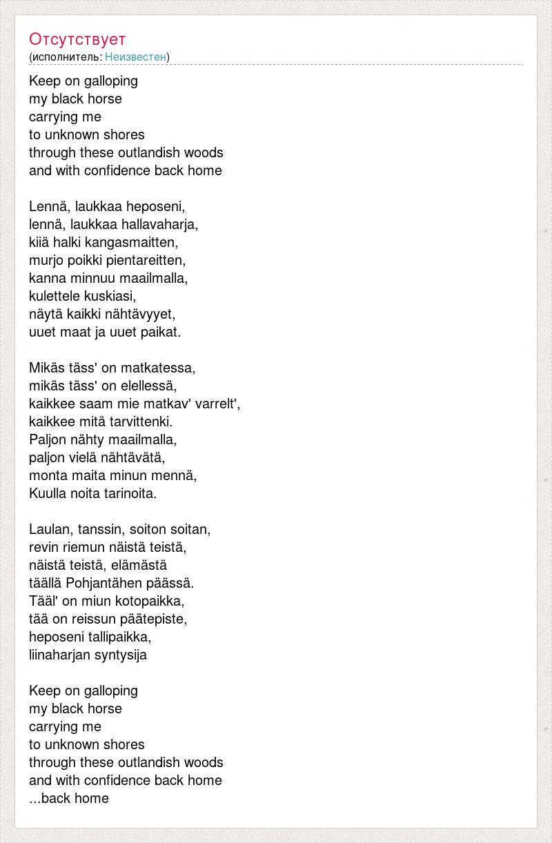 Keep on galloping my black horse carrying me to unknown shores through these outlandish woods and with confidence back home Lennä, laukkaa heposeni, lennä, laukkaa hallavaharja, kiiä halki kangasmaitten, murjo poikki pientareitten, kanna minnuu maailmalla, kulettele kuskiasi, näytä kaikki nähtävyyet, uuet maat ja uuet paikat. Mikäs täss' on matkatessa, mikäs täss' on elellessä, kaikkee saam mie matkav' varrelt', kaikkee mitä tarvittenki. Paljon nähty maailmalla, paljon vielä nähtävätä, monta maita minun mennä, Kuulla noita tarinoita. Laulan, tanssin, soiton soitan, revin riemun näistä teistä, näistä teistä, elämästä täällä Pohjantähen päässä. Tääl' on miun kotopaikka, tää on reissun päätepiste, heposeni tallipaikka, liinaharjan syntysija Keep on galloping my black horse carrying me to unknown shores through these outlandish woods and with confidence back home ...back home