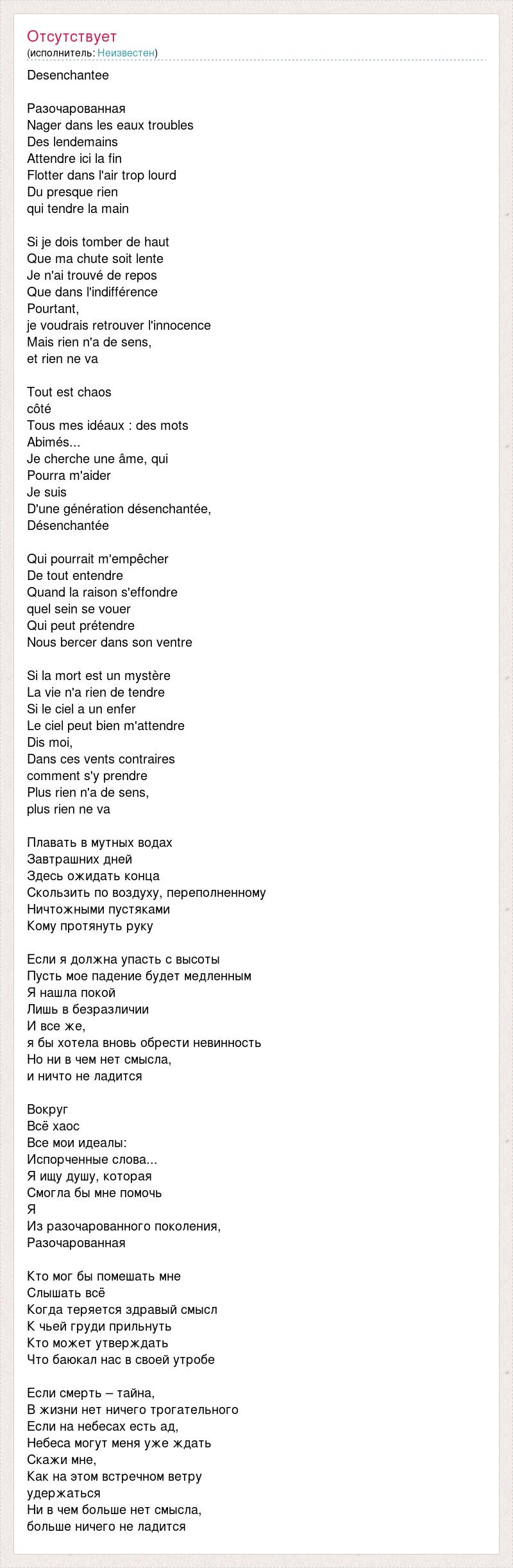 Desenchantee Разочарованная Nager dans les eaux troubles Des lendemains Attendre ici la fin Flotter dans l'air trop lourd Du presque rien qui tendre la main Si je dois tomber de haut Que ma chute soit lente Je n'ai trouvé de repos Que dans l'indifférence Pourtant, je voudrais retrouver l'innocence Mais rien n'a de sens, et rien ne va Tout est chaos côté Tous mes idéaux : des mots Abimés... Je cherche une âme, qui Pourra m'aider Je suis D'une génération désenchantée, Désenchantée Qui pourrait m'empêcher De tout entendre Quand la raison s'effondre quel sein se vouer Qui peut prétendre Nous bercer dans son ventre Si la mort est un mystère La vie n'a rien de tendre Si le ciel a un enfer Le ciel peut bien m'attendre Dis moi, Dans ces vents contraires comment s'y prendre Plus rien n'a de sens, plus rien ne va Плавать в мутных водах Завтрашних дней Здесь ожидать конца Скользить по воздуху, переполненному Ничтожными пустяками Кому протянуть руку Если я должна упасть с высоты Пусть мое падение будет медленным Я нашла покой Лишь в безразличии И все же, я бы хотела вновь обрести невинность Но ни в чем нет смысла, и ничто не ладится Вокруг Всё хаос Все мои идеалы: Испорченные слова... Я ищу душу, которая Смогла бы мне помочь Я Из разочарованного поколения, Разочарованная Кто мог бы помешать мне Слышать всё Когда теряется здравый смысл К чьей груди прильнуть Кто может утверждать Что баюкал нас в своей утробе Если смерть – тайна, В жизни нет ничего трогательного Если на небесах есть ад, Небеса могут меня уже ждать Скажи мне, Как на этом встречном ветру удержаться Ни в чем больше нет смысла, больше ничего не ладится