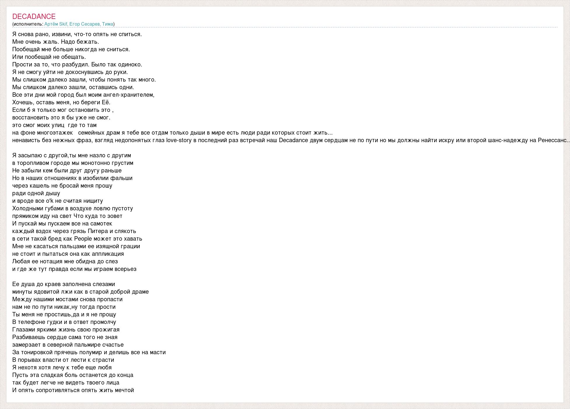 Я снова рано, извини, что-то опять не спиться. Мне очень жаль. Надо бежать. Пообещай мне больше никогда не сниться. Или пообещай не обещать. Прости за то, что разбудил. Было так одиноко. Я не смогу уйти не докоснувшись до руки. Мы слишком далеко зашли, чтобы понять так много. Мы слишком далеко зашли, оставшись одни. Все эти дни мой город был моим ангел-хранителем, Хочешь, оставь меня, но береги Её. Если б я только мог остановить это , восстановить это я бы уже не смог. это смог моих улиц где то там на фоне многоэтажек семейных драм я тебе все отдам только дыши в мире есть люди ради которых стоит жить... ненависть без нежных фраз, взгляд недопонятых глаз love-story в последний раз встречай наш Decadance двум сердцам не по пути но мы должны найти искру или второй шанс-надежду на Ренессанс.. Я засыпаю с другой,ты мне назло с другим в торопливом городе мы монотонно грустим Не забыли кем были друг другу раньше Но в наших отношениях в изобилии фальши через кашель не бросай меня прошу ради одной дышу и вроде все о'k не считая нищиту Холодными губами в воздухе ловлю пустоту прямиком иду на свет Что куда то зовет И пускай мы пускаем все на самотек каждый вздох через грязь Питера и слякоть в сети такой бред как People может это хавать Мне не касаться пальцами ее изящной грации не стоит и пытаться она как аппликация Любая ее нотация мне обидна до слез и где же тут правда если мы играем всерьез Ее душа до краев заполнена слезами минуты ядовитой лжи как в старой доброй драме Между нашими мостами снова пропасти нам не по пути никак,ну тогда прости Ты меня не простишь,да и я не прощу В телефоне гудки и в ответ промолчу Глазами яркими жизнь свою прожигая Разбиваешь сердце сама того не зная замерзает в северной пальмире счастье За тонировкой прячешь полумир и делишь все на масти В порывах власти от лести к страсти Я нехотя хотя лечу к тебе еще любя Пусть эта сладкая боль останется до конца так будет легче не видеть твоего лица И опять сопротивляться опять жить мечтой