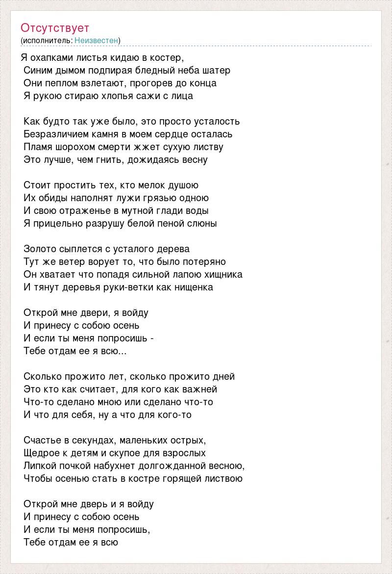 Я охапками листья кидаю в костер, Синим дымом подпирая бледный неба шатер Они пеплом взлетают, прогорев до конца Я рукою стираю хлопья сажи с лица Как будто так уже было, это просто усталость Безразличием камня в моем сердце осталась Пламя шорохом смерти жжет сухую листву Это лучше, чем гнить, дожидаясь весну Стоит простить тех, кто мелок душою Их обиды наполнят лужи грязью одною И свою отраженье в мутной глади воды Я прицельно разрушу белой пеной слюны Золото сыплется с усталого дерева Тут же ветер ворует то, что было потеряно Он хватает что попадя сильной лапою хищника И тянут деревья руки-ветки как нищенка Открой мне двери, я войду И принесу с собою осень И если ты меня попросишь - Тебе отдам ее я всю... Сколько прожито лет, сколько прожито дней Это кто как считает, для кого как важней Что-то сделано мною или сделано что-то И что для себя, ну а что для кого-то Счастье в секундах, маленьких острых, Щедрое к детям и скупое для взрослых Липкой почкой набухнет долгожданной весною, Чтобы осенью стать в костре горящей листвою Открой мне дверь и я войду И принесу с собою осень И если ты меня попросишь, Тебе отдам ее я всю