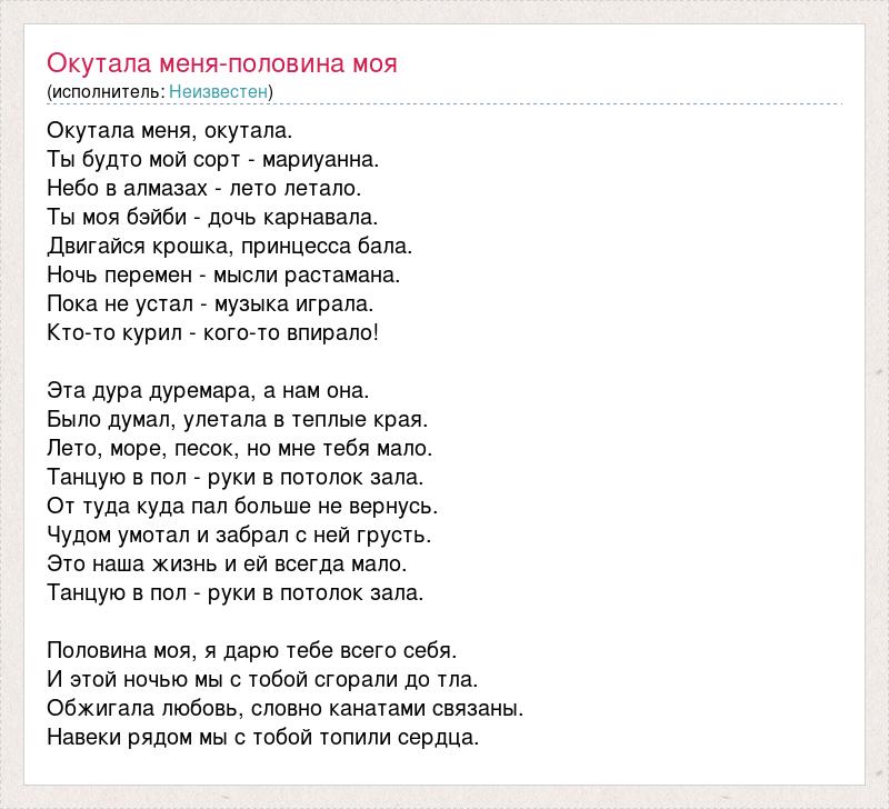 Окутала меня, окутала. Ты будто мой сорт - мариуанна. Небо в алмазах - лето летало. Ты моя бэйби - дочь карнавала. Двигайся крошка, принцесса бала. Ночь перемен - мысли растамана. Пока не устал - музыка играла. Кто-то курил - кого-то впирало! Эта дура дуремара, а нам она. Было думал, улетала в теплые края. Лето, море, песок, но мне тебя мало. Танцую в пол - руки в потолок зала. От туда куда пал больше не вернусь. Чудом умотал и забрал с ней грусть. Это наша жизнь и ей всегда мало. Танцую в пол - руки в потолок зала. Половина моя, я дарю тебе всего себя. И этой ночью мы с тобой сгорали до тла. Обжигала любовь, словно канатами связаны. Навеки рядом мы с тобой топили сердца.
