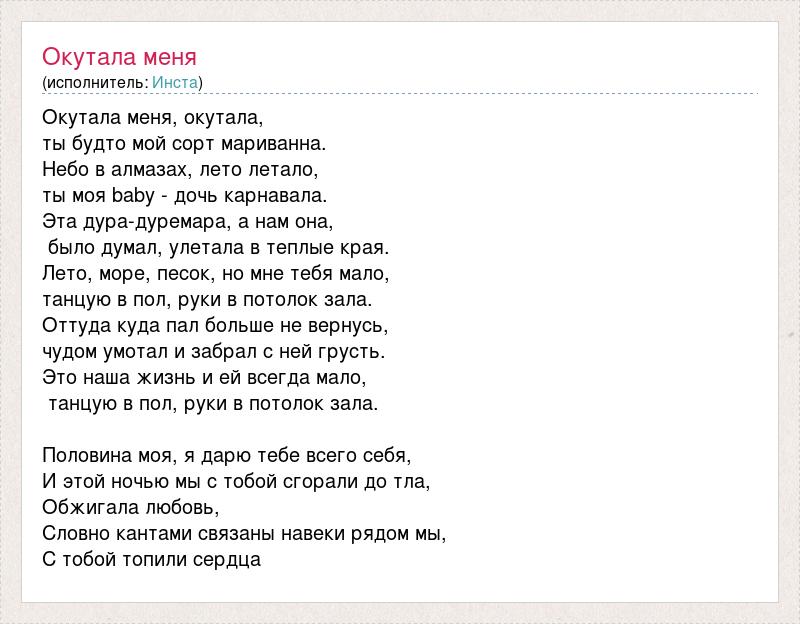 Окутала меня, окутала, ты будто мой сорт мариванна. Небо в алмазах, лето летало, ты моя baby - дочь карнавала. Эта дура-дуремара, а нам она, было думал, улетала в теплые края. Лето, море, песок, но мне тебя мало, танцую в пол, руки в потолок зала. Оттуда куда пал больше не вернусь, чудом умотал и забрал с ней грусть. Это наша жизнь и ей всегда мало, танцую в пол, руки в потолок зала. Половина моя, я дарю тебе всего себя, И этой ночью мы с тобой сгорали до тла, Обжигала любовь, Словно кантами связаны навеки рядом мы, С тобой топили сердца