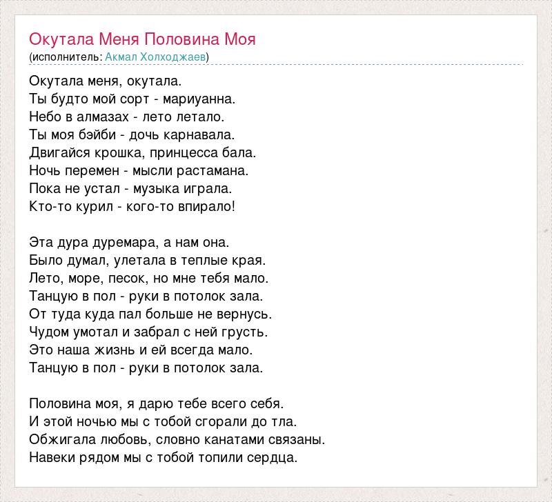 Окутала меня, окутала. Ты будто мой сорт - мариуанна. Небо в алмазах - лето летало. Ты моя бэйби - дочь карнавала. Двигайся крошка, принцесса бала. Ночь перемен - мысли растамана. Пока не устал - музыка играла. Кто-то курил - кого-то впирало! Эта дура дуремара, а нам она. Было думал, улетала в теплые края. Лето, море, песок, но мне тебя мало. Танцую в пол - руки в потолок зала. От туда куда пал больше не вернусь. Чудом умотал и забрал с ней грусть. Это наша жизнь и ей всегда мало. Танцую в пол - руки в потолок зала. Половина моя, я дарю тебе всего себя. И этой ночью мы с тобой сгорали до тла. Обжигала любовь, словно канатами связаны. Навеки рядом мы с тобой топили сердца.