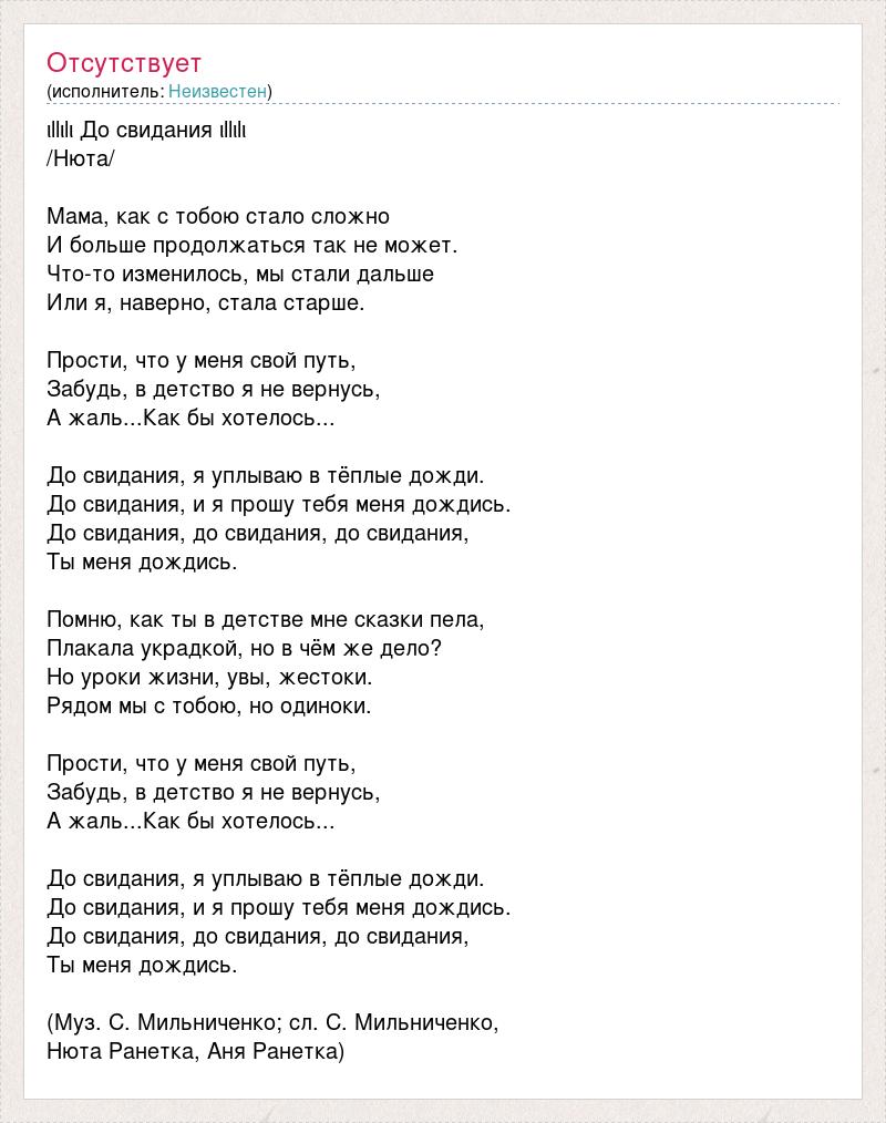 ιllιlι До свидания ιllιlι /Нюта/ Мама, как с тобою стало сложно И больше продолжаться так не может. Что-то изменилось, мы стали дальше Или я, наверно, стала старше. Прости, что у меня свой путь, Забудь, в детство я не вернусь, А жаль...Как бы хотелось... До свидания, я уплываю в тёплые дожди. До свидания, и я прошу тебя меня дождись. До свидания, до свидания, до свидания, Ты меня дождись. Помню, как ты в детстве мне сказки пела, Плакала украдкой, но в чём же дело? Но уроки жизни, увы, жестоки. Рядом мы с тобою, но одиноки. Прости, что у меня свой путь, Забудь, в детство я не вернусь, А жаль...Как бы хотелось... До свидания, я уплываю в тёплые дожди. До свидания, и я прошу тебя меня дождись. До свидания, до свидания, до свидания, Ты меня дождись. (Муз. С. Мильниченко; сл. С. Мильниченко, Нюта Ранетка, Аня Ранетка)