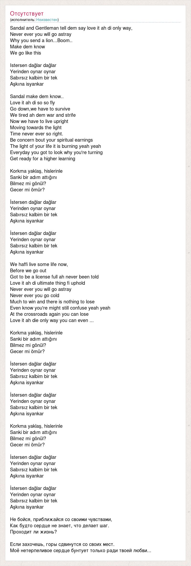 Sandal and Gentleman tell dem say love it ah di only way, Never ever you will go astray Why you send a lion...Boom.. Make dem know We go like this Istersen dağlar dağlar Yerinden oynar oynar Sabırsız kalbim bir tek Aşkına isyankar Sandal make dem know.. Love it ah di so so fly Go down,we have to survive We tired ah dem war and strife Now we have to live upright Moving towards the light Time never ever so right. Be concern bout your spiritual earnings The light of your life it is burning yeah yeah Everyday you got to look why you're turning Get ready for a higher learning Korkma yaklaş, hislerinle Sanki bir adım attığını Bilmez mi gönül? Gecer mi ömür? İstersen dağlar dağlar Yerinden oynar oynar Sabırsız kalbim bir tek Aşkına isyankar İstersen dağlar dağlar Yerinden oynar oynar Sabırsız kalbim bir tek Aşkına isyankar We haffi live some life now, Before we go out Got to be a license full ah never been told Love it ah di ultimate thing fi uphold Never ever you will go astray Never ever you go cold Much to win and there is nothing to lose Even know you're might still confuse yeah yeah At the crossroads again you can lose Love it ah die only way you can even ... Korkma yaklaş, hislerinle Sanki bir adım attığını Bilmez mi gönül? Gecer mi ömür? İstersen dağlar dağlar Yerinden oynar oynar Sabırsız kalbim bir tek Aşkına isyankar İstersen dağlar dağlar Yerinden oynar oynar Sabırsız kalbim bir tek Aşkına isyankar Korkma yaklaş, hislerinle Sanki bir adım attığını Bilmez mi gönül? Gecer mi ömür? İstersen dağlar dağlar Yerinden oynar oynar Sabırsız kalbim bir tek Aşkına isyankar İstersen dağlar dağlar Yerinden oynar oynar Sabırsız kalbim bir tek Aşkına isyankar Не бойся, приближайся со своими чувствами, Как будто сердце не знает, что делает шаг. Проходит ли жизнь? Если захочешь, горы сдвинутся со своих мест. Моё нетерпеливое сердце бунтует только ради твоей любви...
