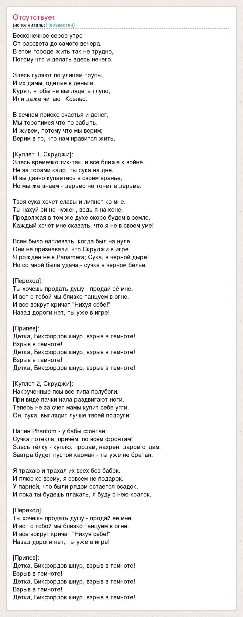 Бесконечное серое утро - От рассвета до самого вечера. В этом городе жить так не трудно, Потому что и делать здесь нечего. Здесь гуляют по улицам трупы, И их дамы, одетые в деньги. Курят, чтобы не выглядеть глупо, Или даже читают Коэльо. В вечном поиске счастья и денег, Мы торопимся что-то забыть. И живем, потому что мы верим; Верим в то, что нам нравится жить. [Куплет 1, Скруджи]: Здесь времечко тик-так, и все ближе к войне. Не за горами кадр, ты сука на дне. И вы давно купаетесь в своем вранье, Но мы же знаем - дерьмо не тонет в дерьме. Твоя сука хочет славы и липнет ко мне. Ты нахуй ей не нужен, ведь я на коне. Продолжая в том же духе скоро будем в земле. Каждый хочет мне сказать, что я не в своем уме! Всем было наплевать, когда был на нуле. Они не признавали, что Скруджи в игре. Я рождён не в Panamera; Сука, в чёрной дыре! Но со мной была удача - сучка в черном белье. [Переход]: Ты хочешь продать душу - продай её мне. И вот с тобой мы близко танцуем в огне. И все вокруг кричат "Нихуя себе!" Назад дороги нет, ты уже в игре! [Припев]: Детка, Бикфордов шнур, взрыв в темноте! Взрыв в темноте! Детка, Бикфордов шнур, взрыв в темноте! Взрыв в темноте! Детка, Бикфордов шнур, взрыв в темноте! [Куплет 2, Скруджи]: Накрученные псы все типа полубоги. При виде пачки нала раздвигают ноги. Теперь не за счет мамы купит себе угги. Он, сука, выглядит лучше твоей подруги! Папин Phantom - у бабы фонтан! Сучка потекла, причём, по всем фронтам! Здесь тёлку - куплю, продам; нахрен, даром отдам. Завтра будет пустой карман - ты уже не братан. Я трахаю и трахал их всех без бабок. И плюс ко всему, я совсем не подарок. У парней, что были рядом остается осадок. И пока ты будешь плакать, я буду с нею краток. [Переход]: Ты хочешь продать душу - продай ее мне. И вот с тобой мы близко танцуем в огне. И все вокруг кричат "Нихуя себе!" Назад дороги нет, ты уже в игре! [Припев]: Детка, Бикфордов шнур, взрыв в темноте! Взрыв в темноте! Детка, Бикфордов шнур, взрыв в темноте! Взрыв в темноте! Детка, Бикфордов шнур, взрыв в темноте!