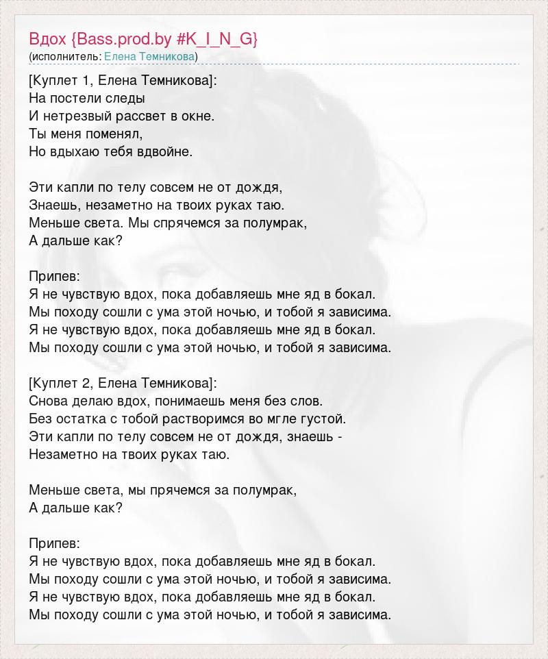 [Куплет 1, Елена Темникова]: На постели следы И нетрезвый рассвет в окне. Ты меня поменял, Но вдыхаю тебя вдвойне. Эти капли по телу совсем не от дождя, Знаешь, незаметно на твоих руках таю. Меньше света. Мы спрячемся за полумрак, А дальше как? Припев: Я не чувствую вдох, пока добавляешь мне яд в бокал. Мы походу сошли с ума этой ночью, и тобой я зависима. Я не чувствую вдох, пока добавляешь мне яд в бокал. Мы походу сошли с ума этой ночью, и тобой я зависима. [Куплет 2, Елена Темникова]: Снова делаю вдох, понимаешь меня без слов. Без остатка с тобой растворимся во мгле густой. Эти капли по телу совсем не от дождя, знаешь - Незаметно на твоих руках таю. Меньше света, мы прячемся за полумрак, А дальше как? Припев: Я не чувствую вдох, пока добавляешь мне яд в бокал. Мы походу сошли с ума этой ночью, и тобой я зависима. Я не чувствую вдох, пока добавляешь мне яд в бокал. Мы походу сошли с ума этой ночью, и тобой я зависима.