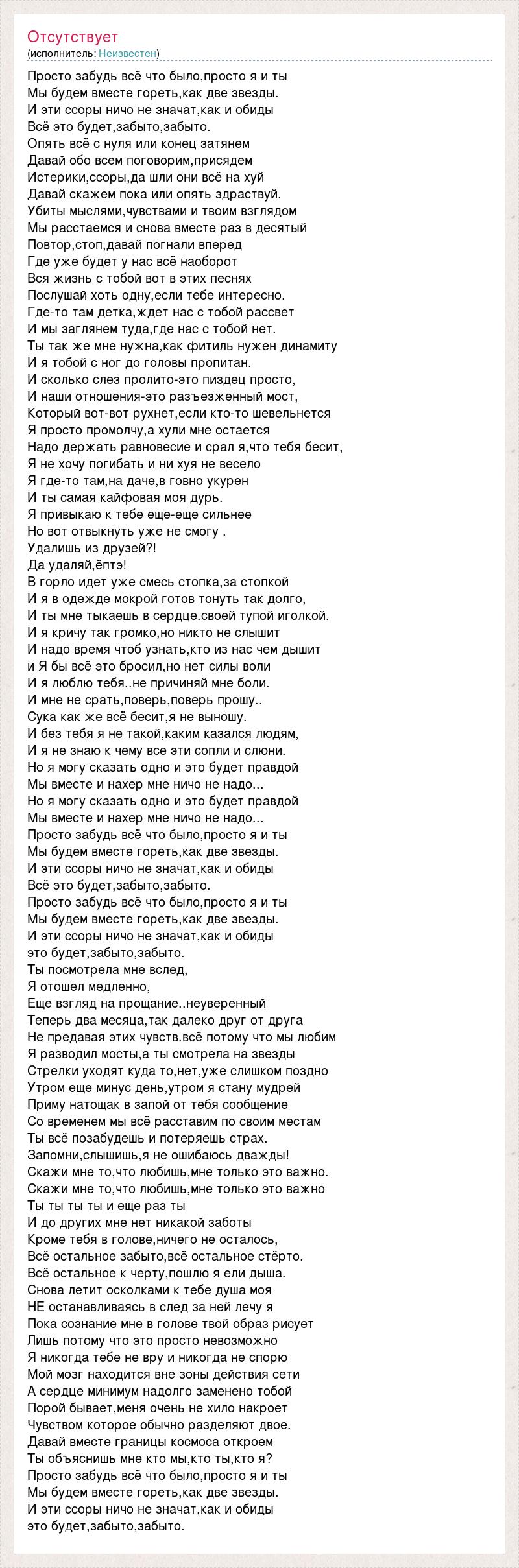 Просто забудь всё что было,просто я и ты Мы будем вместе гореть,как две звезды. И эти ссоры ничо не значат,как и обиды Всё это будет,забыто,забыто. Опять всё с нуля или конец затянем Давай обо всем поговорим,присядем Истерики,ссоры,да шли они всё на хуй Давай скажем пока или опять здраствуй. Убиты мыслями,чувствами и твоим взглядом Мы расстаемся и снова вместе раз в десятый Повтор,стоп,давай погнали вперед Где уже будет у нас всё наоборот Вся жизнь с тобой вот в этих песнях Послушай хоть одну,если тебе интересно. Где-то там детка,ждет нас с тобой рассвет И мы заглянем туда,где нас с тобой нет. Ты так же мне нужна,как фитиль нужен динамиту И я тобой с ног до головы пропитан. И сколько слез пролито-это пиздец просто, И наши отношения-это разъезженный мост, Который вот-вот рухнет,если кто-то шевельнется Я просто промолчу,а хули мне остается Надо держать равновесие и срал я,что тебя бесит, Я не хочу погибать и ни хуя не весело Я где-то там,на даче,в говно укурен И ты самая кайфовая моя дурь. Я привыкаю к тебе еще-еще сильнее Но вот отвыкнуть уже не смогу . Удалишь из друзей?! Да удаляй,ёптэ! В горло идет уже смесь стопка,за стопкой И я в одежде мокрой готов тонуть так долго, И ты мне тыкаешь в сердце.своей тупой иголкой. И я кричу так громко,но никто не слышит И надо время чтоб узнать,кто из нас чем дышит и Я бы всё это бросил,но нет силы воли И я люблю тебя..не причиняй мне боли. И мне не срать,поверь,поверь прошу.. Сука как же всё бесит,я не выношу. И без тебя я не такой,каким казался людям, И я не знаю к чему все эти сопли и слюни. Но я могу сказать одно и это будет правдой Мы вместе и нахер мне ничо не надо... Но я могу сказать одно и это будет правдой Мы вместе и нахер мне ничо не надо... Просто забудь всё что было,просто я и ты Мы будем вместе гореть,как две звезды. И эти ссоры ничо не значат,как и обиды Всё это будет,забыто,забыто. Просто забудь всё что было,просто я и ты Мы будем вместе гореть,как две звезды. И эти ссоры ничо не значат,как и обиды это будет,забыто,забыто. Ты посмотрела мне вслед, Я отошел медленно, Еще взгляд на прощание..неуверенный Теперь два месяца,так далеко друг от друга Не предавая этих чувств.всё потому что мы любим Я разводил мосты,а ты смотрела на звезды Стрелки уходят куда то,нет,уже слишком поздно Утром еще минус день,утром я стану мудрей Приму натощак в запой от тебя сообщение Со временем мы всё расставим по своим местам Ты всё позабудешь и потеряешь страх. Запомни,слышишь,я не ошибаюсь дважды! Скажи мне то,что любишь,мне только это важно. Скажи мне то,что любишь,мне только это важно Ты ты ты ты и еще раз ты И до других мне нет никакой заботы Кроме тебя в голове,ничего не осталось, Всё остальное забыто,всё остальное стёрто. Всё остальное к черту,пошлю я ели дыша. Снова летит осколками к тебе душа моя НЕ останавливаясь в след за ней лечу я Пока сознание мне в голове твой образ рисует Лишь потому что это просто невозможно Я никогда тебе не вру и никогда не спорю Мой мозг находится вне зоны действия сети А сердце минимум надолго заменено тобой Порой бывает,меня очень не хило накроет Чувством которое обычно разделяют двое. Давай вместе границы космоса откроем Ты объяснишь мне кто мы,кто ты,кто я? Просто забудь всё что было,просто я и ты Мы будем вместе гореть,как две звезды. И эти ссоры ничо не значат,как и обиды это будет,забыто,забыто.