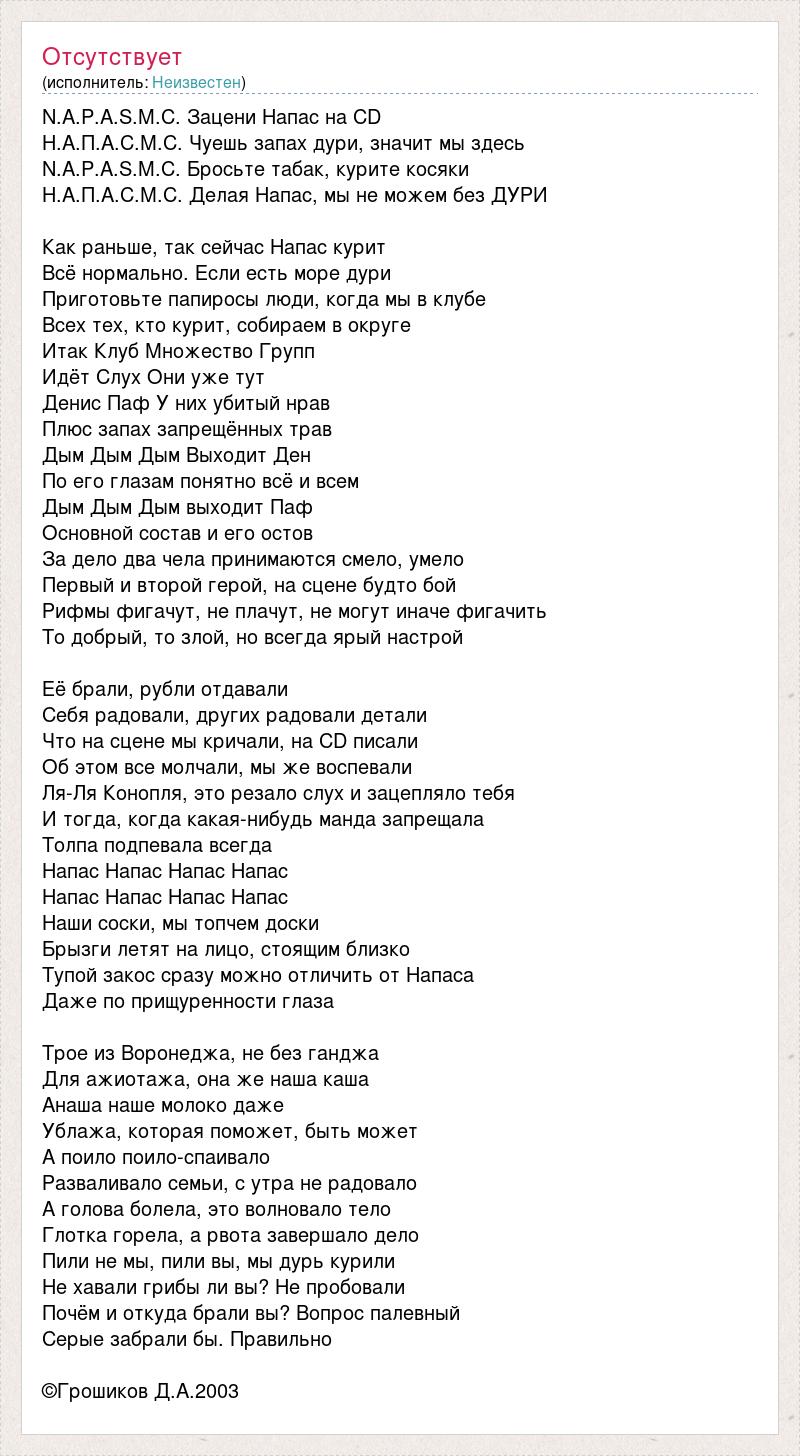 N.A.P.A.S.M.C. Зацени Напас на CD Н.А.П.А.С.М.С. Чуешь запах дури, значит мы здесь N.A.P.A.S.M.C. Бросьте табак, курите косяки Н.А.П.А.С.М.С. Делая Напас, мы не можем без ДУРИ Как раньше, так сейчас Напас курит Всё нормально. Если есть море дури Приготовьте папиросы люди, когда мы в клубе Всех тех, кто курит, собираем в округе Итак Клуб Множество Групп Идёт Слух Они уже тут Денис Паф У них убитый нрав Плюс запах запрещённых трав Дым Дым Дым Выходит Ден По его глазам понятно всё и всем Дым Дым Дым выходит Паф Основной состав и его остов За дело два чела принимаются смело, умело Первый и второй герой, на сцене будто бой Рифмы фигачут, не плачут, не могут иначе фигачить То добрый, то злой, но всегда ярый настрой Её брали, рубли отдавали Себя радовали, других радовали детали Что на сцене мы кричали, на CD писали Об этом все молчали, мы же воспевали Ля-Ля Конопля, это резало слух и зацепляло тебя И тогда, когда какая-нибудь манда запрещала Толпа подпевала всегда Напас Напас Напас Напас Напас Напас Напас Напас Наши соски, мы топчем доски Брызги летят на лицо, стоящим близко Тупой закос сразу можно отличить от Напаса Даже по прищуренности глаза Трое из Воронеджа, не без ганджа Для ажиотажа, она же наша каша Анаша наше молоко даже Ублажа, которая поможет, быть может А поило поило-спаивало Разваливало семьи, с утра не радовало А голова болела, это волновало тело Глотка горела, а рвота завершало дело Пили не мы, пили вы, мы дурь курили Не хавали грибы ли вы? Не пробовали Почём и откуда брали вы? Вопрос палевный Серые забрали бы. Правильно ©Грошиков Д.А.2003