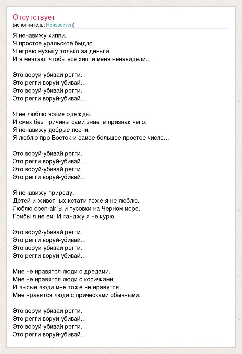 Я ненавижу хиппи. Я простое уральское быдло. Я играю музыку только за деньги. И я мечтаю, чтобы все хиппи меня ненавидели... Это воруй-убивай регги. Это регги воруй-убивай... Это воруй-убивай регги. Это регги воруй-убивай... Я не люблю яркие одежды. И смех без причины сами знаете признак чего. Я ненавижу добрые песни. Я люблю про Восток и самое большое простое число... Это воруй-убивай регги. Это регги воруй-убивай... Это воруй-убивай регги. Это регги воруй-убивай... Я ненавижу природу. Детей и животных кстати тоже я не люблю. Люблю open-air`ы и тусовки на Черном море. Грибы я не ем. И ганджу я не курю. Это воруй-убивай регги. Это регги воруй-убивай... Это воруй-убивай регги. Это регги воруй-убивай... Мне не нравятся люди с дредами. Мне не нравятся люди с косичками. И лысые люди мне тоже не нравятся. Мне нравятся люди с прическами обычными. Это воруй-убивай регги. Это регги воруй-убивай... Это воруй-убивай регги. Это регги воруй-убивай...