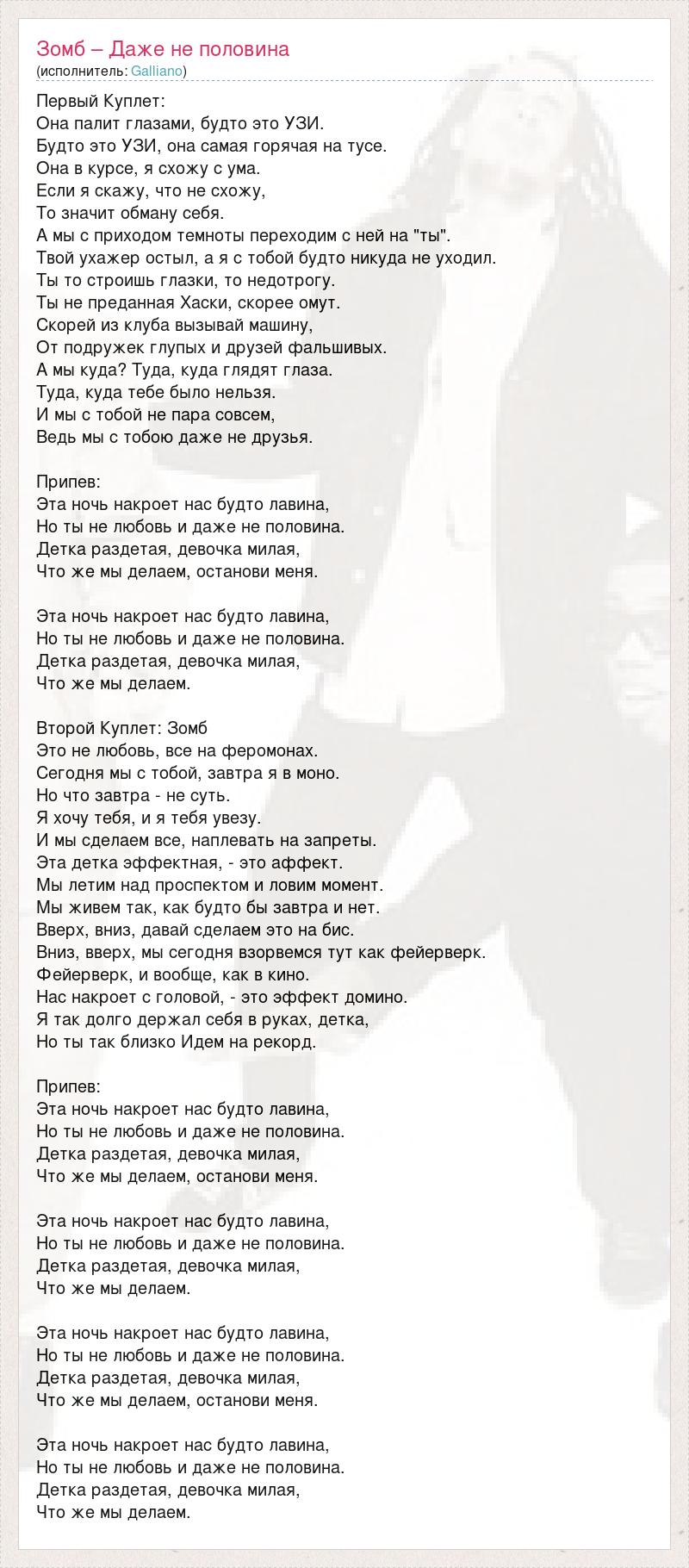 Первый Куплет: Она палит глазами, будто это УЗИ. Будто это УЗИ, она самая горячая на тусе. Она в курсе, я схожу с ума. Если я скажу, что не схожу, То значит обману себя. А мы с приходом темноты переходим с ней на "ты". Твой ухажер остыл, а я с тобой будто никуда не уходил. Ты то строишь глазки, то недотрогу. Ты не преданная Хаски, скорее омут. Скорей из клуба вызывай машину, От подружек глупых и друзей фальшивых. А мы куда? Туда, куда глядят глаза. Туда, куда тебе было нельзя. И мы с тобой не пара совсем, Ведь мы с тобою даже не друзья. Припев: Эта ночь накроет нас будто лавина, Но ты не любовь и даже не половина. Детка раздетая, девочка милая, Что же мы делаем, останови меня. Эта ночь накроет нас будто лавина, Но ты не любовь и даже не половина. Детка раздетая, девочка милая, Что же мы делаем. Второй Куплет: Зомб Это не любовь, все на феромонах. Сегодня мы с тобой, завтра я в моно. Но что завтра - не суть. Я хочу тебя, и я тебя увезу. И мы сделаем все, наплевать на запреты. Эта детка эффектная, - это аффект. Мы летим над проспектом и ловим момент. Мы живем так, как будто бы завтра и нет. Вверх, вниз, давай сделаем это на бис. Вниз, вверх, мы сегодня взорвемся тут как фейерверк. Фейерверк, и вообще, как в кино. Нас накроет с головой, - это эффект домино. Я так долго держал себя в руках, детка, Но ты так близко Идем на рекорд. Припев: Эта ночь накроет нас будто лавина, Но ты не любовь и даже не половина. Детка раздетая, девочка милая, Что же мы делаем, останови меня. Эта ночь накроет нас будто лавина, Но ты не любовь и даже не половина. Детка раздетая, девочка милая, Что же мы делаем. Эта ночь накроет нас будто лавина, Но ты не любовь и даже не половина. Детка раздетая, девочка милая, Что же мы делаем, останови меня. Эта ночь накроет нас будто лавина, Но ты не любовь и даже не половина. Детка раздетая, девочка милая, Что же мы делаем.