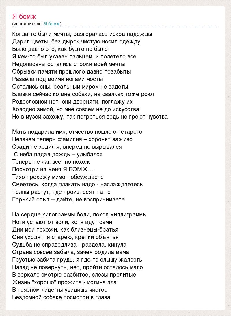 Когда-то были мечты, разгоралась искра надежды Дарил цветы, без дырок чистую носил одежду Было давно это, как будто не было Я кем-то был указан пальцем, и полетело все Недописаны остались строки моей мечты Обрывки памяти прошлого давно позабыты Развели под моими ногами мосты Остались сны, реальным миром не задеты Близки сейчас ко мне собаки, на свалках тоже роют Родословной нет, они дворняги, поглажу их Холодно зимой, но мне совсем не до искусства Но в музеи захожу, так погреться ведь не греют чувства Мать подарила имя, отчество пошло от старого Незачем теперь фамилия – хоронят заживо Сзади не ходил я, вперед не вырывался С неба падал дождь – улыбался Теперь не как все, но похож Посмотри на меня Я БОМЖ… Тихо прохожу мимо - обсуждаете Смеетесь, когда плакать надо - наслаждаетесь Толпы растут, где произносят на те Горький опыт – дайте, не воспринимаете На сердце килограммы боли, покоя миллиграммы Ноги устают от воли, хотя идут сами Дни мои похожи, как близнецы-братья Они уходят, я старею, крепки объятья Судьба не справедлива - раздела, кинула Страна совсем забыла, зачем родила мама Грустью забита грудь, я где-то слышу жалость Назад не повернуть, нет, пройти осталось мало В зеркало смотрю разбитое, слезы пролитые Жизнь "хорошо" прожита - истина зла В грязном лице ты увидишь чистое Бездомной собаке посмотри в глаза