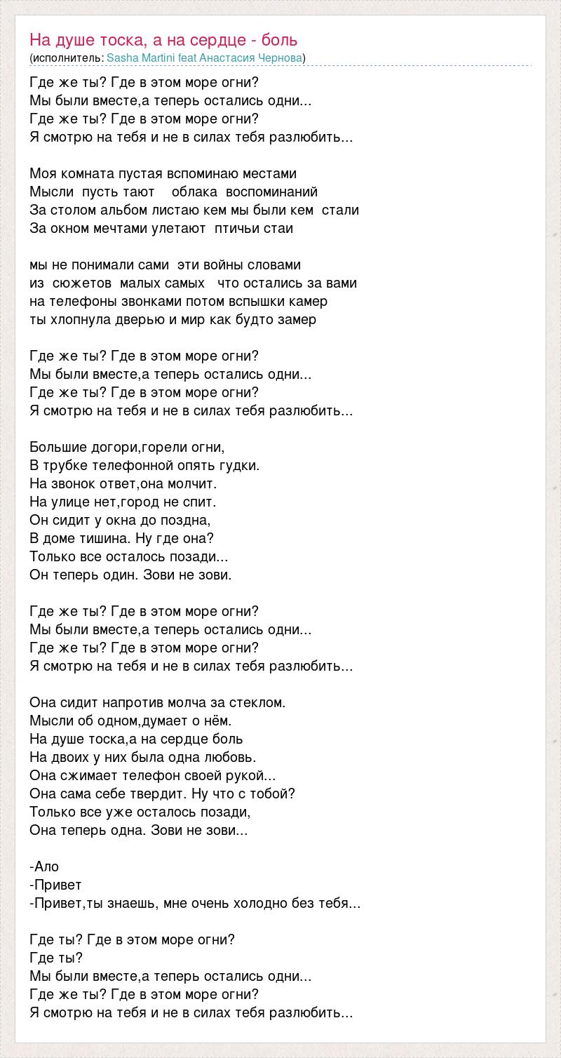 Где же ты? Где в этом море огни? Мы были вместе,а теперь остались одни... Где же ты? Где в этом море огни? Я смотрю на тебя и не в силах тебя разлюбить... Моя комната пустая вспоминаю местами Мысли пусть тают облака воспоминаний За столом альбом листаю кем мы были кем стали За окном мечтами улетают птичьи стаи мы не понимали сами эти войны словами из сюжетов малых самых что остались за вами на телефоны звонками потом вспышки камер ты хлопнула дверью и мир как будто замер Где же ты? Где в этом море огни? Мы были вместе,а теперь остались одни... Где же ты? Где в этом море огни? Я смотрю на тебя и не в силах тебя разлюбить... Большие догори,горели огни, В трубке телефонной опять гудки. На звонок ответ,она молчит. На улице нет,город не спит. Он сидит у окна до поздна, В доме тишина. Ну где она? Только все осталось позади... Он теперь один. Зови не зови. Где же ты? Где в этом море огни? Мы были вместе,а теперь остались одни... Где же ты? Где в этом море огни? Я смотрю на тебя и не в силах тебя разлюбить... Она сидит напротив молча за стеклом. Мысли об одном,думает о нём. На душе тоска,а на сердце боль На двоих у них была одна любовь. Она сжимает телефон своей рукой... Она сама себе твердит. Ну что с тобой? Только все уже осталось позади, Она теперь одна. Зови не зови... -Ало -Привет -Привет,ты знаешь, мне очень холодно без тебя... Где ты? Где в этом море огни? Где ты? Мы были вместе,а теперь остались одни... Где же ты? Где в этом море огни? Я смотрю на тебя и не в силах тебя разлюбить...