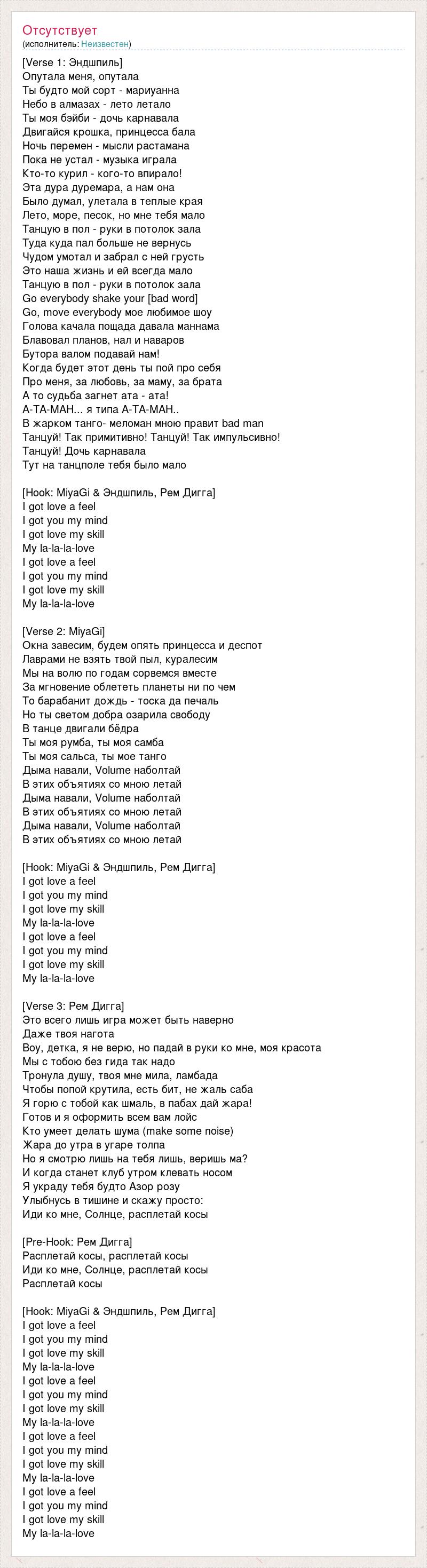 [Verse 1: Эндшпиль] Опутала меня, опутала Ты будто мой сорт - мариуанна Небо в алмазах - лето летало Ты моя бэйби - дочь карнавала Двигайся крошка, принцесса бала Ночь перемен - мысли растамана Пока не устал - музыка играла Кто-то курил - кого-то впирало! Эта дура дуремара, а нам она Было думал, улетала в теплые края Лето, море, песок, но мне тебя мало Танцую в пол - руки в потолок зала Туда куда пал больше не вернусь Чудом умотал и забрал с ней грусть Это наша жизнь и ей всегда мало Танцую в пол - руки в потолок зала Go everybody shake your [bad word] Go, move everybody мое любимое шоу Голова качала пощада давала маннама Блавовал планов, нал и наваров Бутора валом подавай нам! Когда будет этот день ты пой про себя Про меня, за любовь, за маму, за брата А то судьба загнет ата - ата! А-ТА-МАН... я типа А-ТА-МАН.. В жарком танго- меломан мною правит bad man Танцуй! Так примитивно! Танцуй! Так импульсивно! Танцуй! Дочь карнавала Тут на танцполе тебя было мало [Hook: MiyaGi & Эндшпиль, Рем Дигга] I got love a feel I got you my mind I got love my skill My la-la-la-love I got love a feel I got you my mind I got love my skill My la-la-la-love [Verse 2: MiyaGi] Окна завесим, будем опять принцесса и деспот Лаврами не взять твой пыл, куралесим Мы на волю по годам сорвемся вместе За мгновение облететь планеты ни по чем То барабанит дождь - тоска да печаль Но ты светом добра озарила свободу В танце двигали бёдра Ты моя румба, ты моя самба Ты моя сальса, ты мое танго Дыма навали, Volume наболтай В этих объятиях со мною летай Дыма навали, Volume наболтай В этих объятиях со мною летай Дыма навали, Volume наболтай В этих объятиях со мною летай [Hook: MiyaGi & Эндшпиль, Рем Дигга] I got love a feel I got you my mind I got love my skill My la-la-la-love I got love a feel I got you my mind I got love my skill My la-la-la-love [Verse 3: Рем Дигга] Это всего лишь игра может быть наверно Даже твоя нагота Воу, детка, я не верю, но падай в руки ко мне, моя красота Мы с тобою без гида так надо Тронула душу, твоя мне мила, ламбада Чтобы попой крутила, есть бит, не жаль саба Я горю с тобой как шмаль, в пабах дай жара! Готов и я оформить всем вам лойс Кто умеет делать шума (make some noise) Жара до утра в угаре толпа Но я смотрю лишь на тебя лишь, веришь ма? И когда станет клуб утром клевать носом Я украду тебя будто Азор розу Улыбнусь в тишине и скажу просто: Иди ко мне, Солнце, расплетай косы [Pre-Hook: Рем Дигга] Расплетай косы, расплетай косы Иди ко мне, Солнце, расплетай косы Расплетай косы [Hook: MiyaGi & Эндшпиль, Рем Дигга] I got love a feel I got you my mind I got love my skill My la-la-la-love I got love a feel I got you my mind I got love my skill My la-la-la-love I got love a feel I got you my mind I got love my skill My la-la-la-love I got love a feel I got you my mind I got love my skill My la-la-la-love