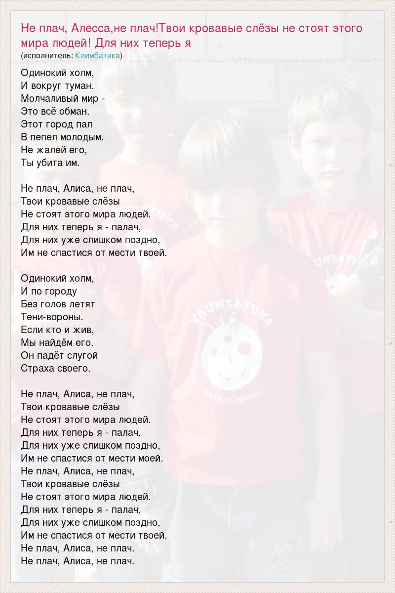 Одинокий холм, И вокруг туман. Молчаливый мир - Это всё обман. Этот город пал В пепел молодым. Не жалей его, Ты убита им. Не плач, Алиса, не плач, Твои кровавые слёзы Не стоят этого мира людей. Для них теперь я - палач, Для них уже слишком поздно, Им не спастися от мести твоей. Одинокий холм, И по городу Без голов летят Тени-вороны. Если кто и жив, Мы найдём его. Он падёт слугой Страха своего. Не плач, Алиса, не плач, Твои кровавые слёзы Не стоят этого мира людей. Для них теперь я - палач, Для них уже слишком поздно, Им не спастися от мести моей. Не плач, Алиса, не плач, Твои кровавые слёзы Не стоят этого мира людей. Для них теперь я - палач, Для них уже слишком поздно, Им не спастися от мести твоей. Не плач, Алиса, не плач. Не плач, Алиса, не плач.