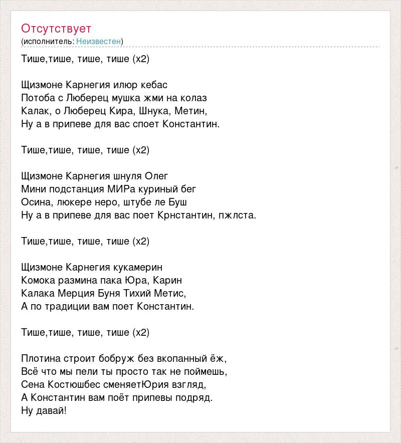 Тише,тише, тише, тише (х2) Щизмоне Карнегия илюр кебас Потоба с Люберец мушка жми на колаз Калак, о Люберец Кира, Шнука, Метин, Ну а в припеве для вас споет Константин. Тише,тише, тише, тише (х2) Щизмоне Карнегия шнуля Олег Мини подстанция МИРа куриный бег Осина, люкере неро, штубе ле Буш Ну а в припеве для вас поет Крнстантин, пжлста. Тише,тише, тише, тише (х2) Щизмоне Карнегия кукамерин Комока размина пака Юра, Карин Калака Мерция Буня Тихий Метис, А по традиции вам поет Константин. Тише,тише, тише, тише (х2) Плотина строит бобруж без вкопанный ёж, Всё что мы пели ты просто так не поймешь, Сена Костюшбес сменяетЮрия взгляд, А Константин вам поёт припевы подряд. Ну давай!