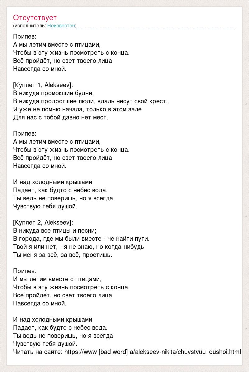 Припев: А мы летим вместе с птицами, Чтобы в эту жизнь посмотреть с конца. Всё пройдёт, но свет твоего лица Навсегда со мной. [Куплет 1, Alekseev]: В никуда промокшие будни, В никуда продрогшие люди, вдаль несут свой крест. Я уже не помню начала, только в этом зале Для нас с тобой давно нет мест. Припев: А мы летим вместе с птицами, Чтобы в эту жизнь посмотреть с конца. Всё пройдёт, но свет твоего лица Навсегда со мной. И над холодными крышами Падает, как будто с небес вода. Ты ведь не поверишь, но я всегда Чувствую тебя душой. [Куплет 2, Alekseev]: В никуда все птицы и песни; В города, где мы были вместе - не найти пути. Твой я или нет, - я не знаю, но когда-нибудь Ты меня за всё, за всё, простишь. Припев: И мы летим вместе с птицами, Чтобы в эту жизнь посмотреть с конца. Всё пройдёт, но свет твоего лица Навсегда со мной. И над холодными крышами Падает, как будто с небес вода. Ты ведь не поверишь, но я всегда Чувствую тебя душой. Читать на сайте: https://www [bad word] a/alekseev-nikita/chuvstvuu_dushoi.html