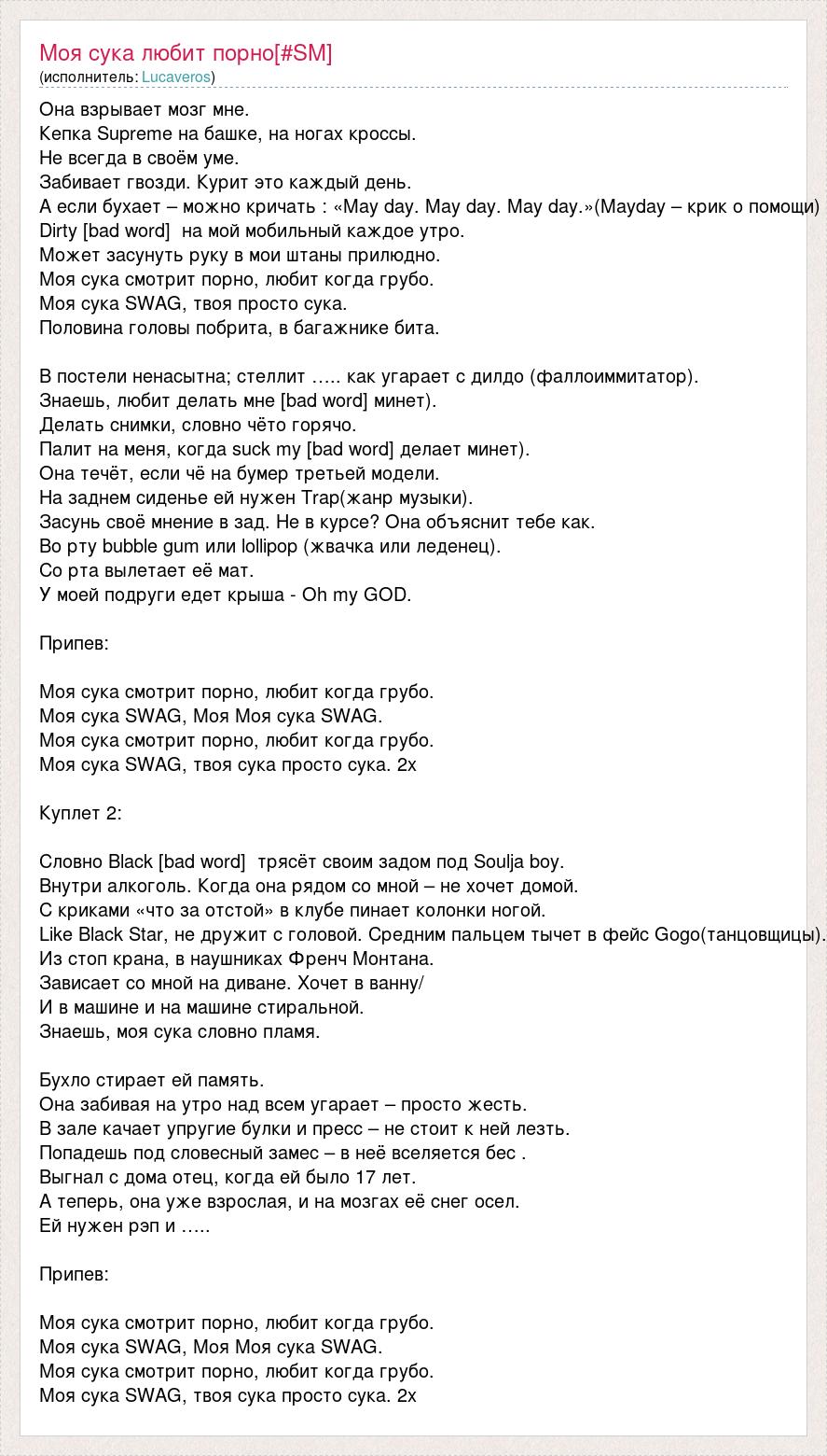 Она взрывает мозг мне. Кепка Supreme на башке, на ногах кроссы. Не всегда в своём уме. Забивает гвозди. Курит это каждый день. А если бухает – можно кричать : «May day. May day. May day.»(Mayday – крик о помощи) Dirty [bad word] на мой мобильный каждое утро. Может засунуть руку в мои штаны прилюдно. Моя сука смотрит порно, любит когда грубо. Моя сука SWAG, твоя просто сука. Половина головы побрита, в багажнике бита. В постели ненасытна; стеллит ….. как угарает с дилдо (фаллоиммитатор). Знаешь, любит делать мне [bad word] минет). Делать снимки, словно чёто горячо. Палит на меня, когда suck my [bad word] делает минет). Она течёт, если чё на бумер третьей модели. На заднем сиденье ей нужен Trap(жанр музыки). Засунь своё мнение в зад. Не в курсе? Она объяснит тебе как. Во рту bubble gum или lollipop (жвачка или леденец). Cо рта вылетает её мат. У моей подруги едет крыша - Oh my GOD. Припев: Моя сука смотрит порно, любит когда грубо. Моя сука SWAG, Моя Моя сука SWAG. Моя сука смотрит порно, любит когда грубо. Моя сука SWAG, твоя сука просто сука. 2х Куплет 2: Словно Black [bad word] трясёт своим задом под Soulja boy. Внутри алкоголь. Когда она рядом со мной – не хочет домой. С криками «что за отстой» в клубе пинает колонки ногой. Like Black Star, не дружит с головой. Средним пальцем тычет в фейс Gogo(танцовщицы). Из стоп крана, в наушниках Френч Монтана. Зависает со мной на диване. Хочет в ванну/ И в машине и на машине стиральной. Знаешь, моя сука словно пламя. Бухло стирает ей память. Она забивая на утро над всем угарает – просто жесть. В зале качает упругие булки и пресс – не стоит к ней лезть. Попадешь под словесный замес – в неё вселяется бес . Выгнал с дома отец, когда ей было 17 лет. А теперь, она уже взрослая, и на мозгах её снег осел. Ей нужен рэп и ….. Припев: Моя сука смотрит порно, любит когда грубо. Моя сука SWAG, Моя Моя сука SWAG. Моя сука смотрит порно, любит когда грубо. Моя сука SWAG, твоя сука просто сука. 2х