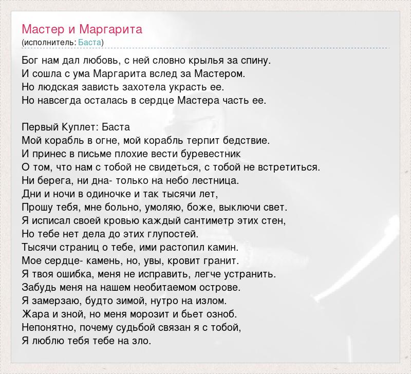 Бог нам дал любовь, с ней словно крылья за спину. И сошла с ума Маргарита вслед за Мастером. Но людская зависть захотела украсть ее. Но навсегда осталась в сердце Мастера часть ее. Первый Куплет: Баста Мой корабль в огне, мой корабль терпит бедствие. И принес в письме плохие вести буревестник О том, что нам с тобой не свидеться, с тобой не встретиться. Ни берега, ни дна- только на небо лестница. Дни и ночи в одиночке и так тысячи лет, Прошу тебя, мне больно, умоляю, боже, выключи свет. Я исписал своей кровью каждый сантиметр этих стен, Но тебе нет дела до этих глупостей. Тысячи страниц о тебе, ими растопил камин. Мое сердце- камень, но, увы, кровит гранит. Я твоя ошибка, меня не исправить, легче устранить. Забудь меня на нашем необитаемом острове. Я замерзаю, будто зимой, нутро на излом. Жара и зной, но меня морозит и бьет озноб. Непонятно, почему судьбой связан я с тобой, Я люблю тебя тебе на зло.