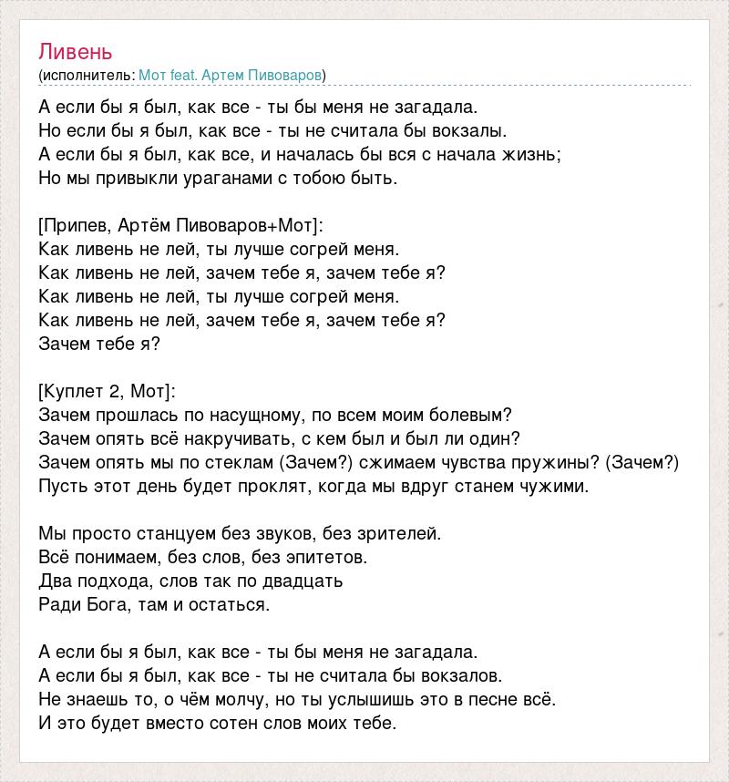 А если бы я был, как все - ты бы меня не загадала. Но если бы я был, как все - ты не считала бы вокзалы. А если бы я был, как все, и началась бы вся с начала жизнь; Но мы привыкли ураганами с тобою быть. [Припев, Артём Пивоваров+Мот]: Как ливень не лей, ты лучше согрей меня. Как ливень не лей, зачем тебе я, зачем тебе я? Как ливень не лей, ты лучше согрей меня. Как ливень не лей, зачем тебе я, зачем тебе я? Зачем тебе я? [Куплет 2, Мот]: Зачем прошлась по насущному, по всем моим болевым? Зачем опять всё накручивать, с кем был и был ли один? Зачем опять мы по стеклам (Зачем?) сжимаем чувства пружины? (Зачем?) Пусть этот день будет проклят, когда мы вдруг станем чужими. Мы просто станцуем без звуков, без зрителей. Всё понимаем, без слов, без эпитетов. Два подхода, слов так по двадцать Ради Бога, там и остаться. А если бы я был, как все - ты бы меня не загадала. А если бы я был, как все - ты не считала бы вокзалов. Не знаешь то, о чём молчу, но ты услышишь это в песне всё. И это будет вместо сотен слов моих тебе.
