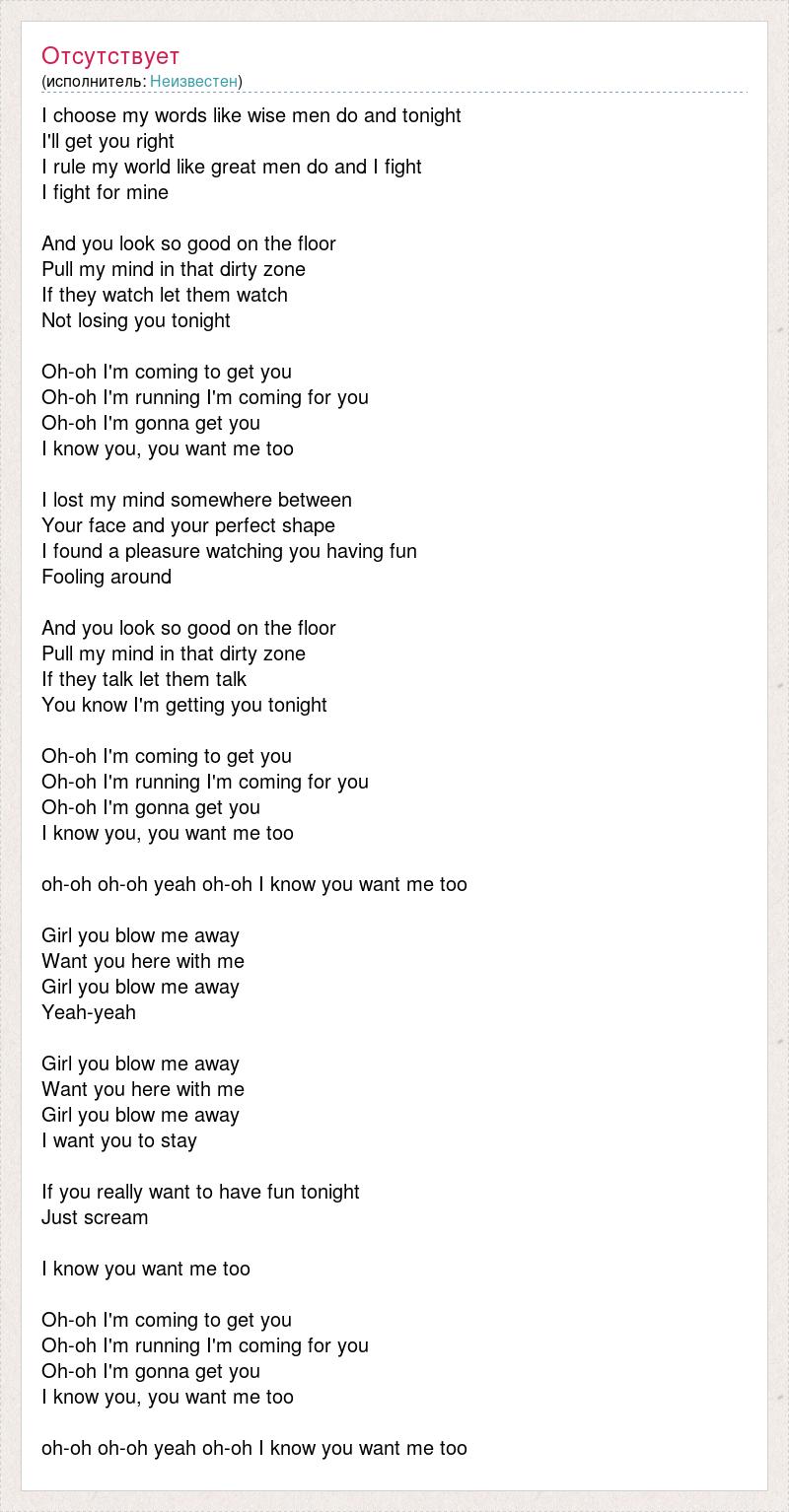 I choose my words like wise men do and tonight I'll get you right I rule my world like great men do and I fight I fight for mine And you look so good on the floor Pull my mind in that dirty zone If they watch let them watch Not losing you tonight Oh-oh I'm coming to get you Oh-oh I'm running I'm coming for you Oh-oh I'm gonna get you I know you, you want me too I lost my mind somewhere between Your face and your perfect shape I found a pleasure watching you having fun Fooling around And you look so good on the floor Pull my mind in that dirty zone If they talk let them talk You know I'm getting you tonight Oh-oh I'm coming to get you Oh-oh I'm running I'm coming for you Oh-oh I'm gonna get you I know you, you want me too oh-oh oh-oh yeah oh-oh I know you want me too Girl you blow me away Want you here with me Girl you blow me away Yeah-yeah Girl you blow me away Want you here with me Girl you blow me away I want you to stay If you really want to have fun tonight Just scream I know you want me too Oh-oh I'm coming to get you Oh-oh I'm running I'm coming for you Oh-oh I'm gonna get you I know you, you want me too oh-oh oh-oh yeah oh-oh I know you want me too