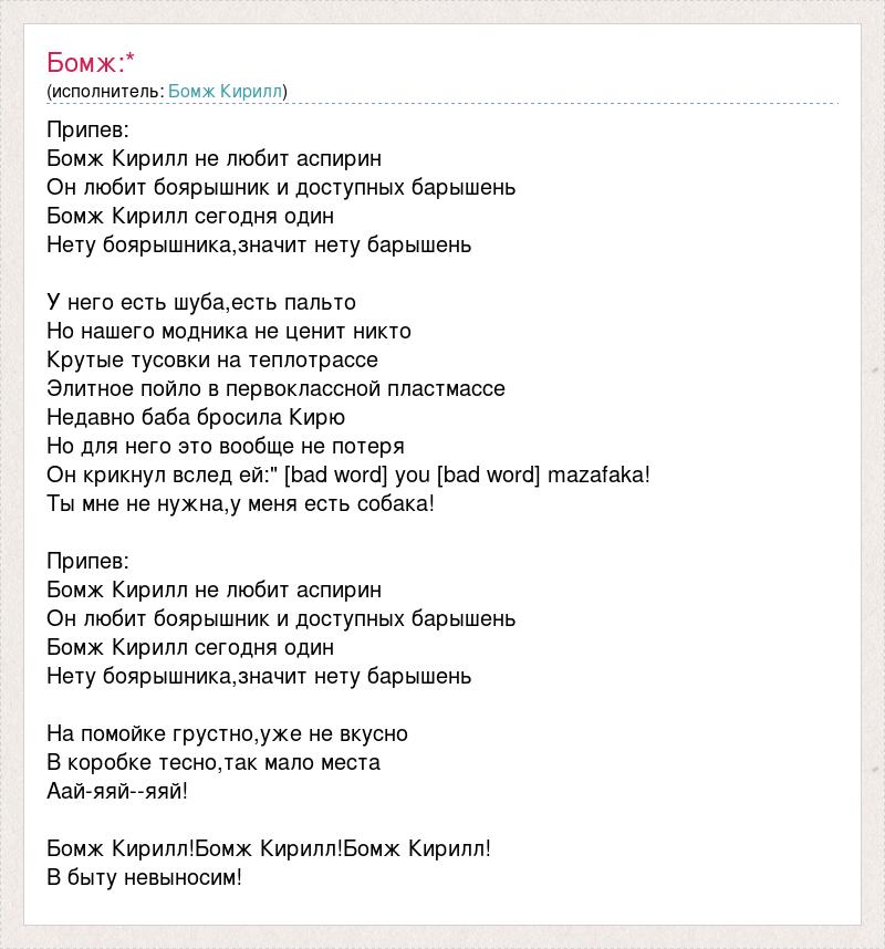 Припев: Бомж Кирилл не любит аспирин Он любит боярышник и доступных барышень Бомж Кирилл сегодня один Нету боярышника,значит нету барышень У него есть шуба,есть пальто Но нашего модника не ценит никто Крутые тусовки на теплотрассе Элитное пойло в первоклассной пластмассе Недавно баба бросила Кирю Но для него это вообще не потеря Он крикнул вслед ей:" [bad word] you [bad word] mazafaka! Ты мне не нужна,у меня есть собака! Припев: Бомж Кирилл не любит аспирин Он любит боярышник и доступных барышень Бомж Кирилл сегодня один Нету боярышника,значит нету барышень На помойке грустно,уже не вкусно В коробке тесно,так мало места Аай-яяй--яяй! Бомж Кирилл!Бомж Кирилл!Бомж Кирилл! В быту невыносим!