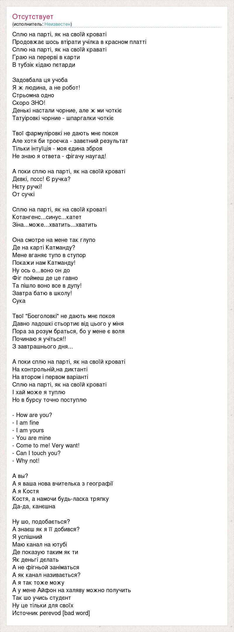 Сплю на парті, як на своїй кроваті Продовжає шось втірати учілка в красном платті Сплю на парті, як на своїй краваті Граю на перерві в карти В тубзік кідаю пєтарди Задовбала ця учоба Я ж людина, а не робот! Стрьомна одно Скоро ЗНО! Денькі настали чорние, але ж ми чоткіє Татуіровкі чорние - шпаргалки чоткіє Твої фармуліровкі не дають мнє покоя Але хотя би троєчка - завєтний результат Тільки інтуїція - моя єдина зброя Не знаю я ответа - фігачу наугад! А поки сплю на парті, як на своїй кроваті Дєвкі, пссс! Є ручка? Нєту ручкі! От сучкі Сплю на парті, як на своїй кроваті Котангенс...синус...катет Зіна...може...хватить...хватить Она смотре на мене так глупо Де на карті Катманду? Мене вганяє тупо в ступор Покажи нам Катманду! Ну ось о...воно он до Фіг поймеш де це гавно Та пішло воно все в дупу! Завтра батю в школу! Сука Твої "Боєголовкі" не дають мнє покоя Давно ладошкі стьортиє від цього у міня Пора за розум браться, бо у мене є воля Починаю я учіться!! З завтрашнього дня... А поки сплю на парті, як на своїй кроваті На контрольній,на диктанті На втором і первом варіанті Сплю на парті, як на своїй кроваті І хай може я туплю Но в бурсу точно поступлю - How are you? - I am fine - I am yours - You are mine - Come to me! Very want! - Can I touch you? - Why not! А вы? А я ваша нова вчителька з географії А я Костя Костя, а намочи будь-ласка тряпку Да-да, канєшна Ну шо, подобається? А знаєш як я її добився? Я успішний Маю канал на ютубі Де показую таким як ти Як деньгі дєлать А не фігньой заніматься А як канал називається? А я так тоже можу А у мене Айфон на халяву можно получить Так шо учись студєнт Ну це тільки для своїх Источник perevod [bad word]