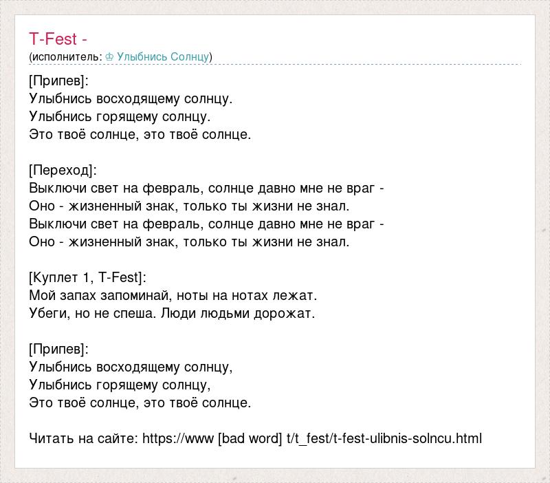 [Припев]: Улыбнись восходящему солнцу. Улыбнись горящему солнцу. Это твоё солнце, это твоё солнце. [Переход]: Выключи свет на февраль, солнце давно мне не враг - Оно - жизненный знак, только ты жизни не знал. Выключи свет на февраль, солнце давно мне не враг - Оно - жизненный знак, только ты жизни не знал. [Куплет 1, T-Fest]: Мой запах запоминай, ноты на нотах лежат. Убеги, но не спеша. Люди людьми дорожат. [Припев]: Улыбнись восходящему солнцу, Улыбнись горящему солнцу, Это твоё солнце, это твоё солнце. Читать на сайте: https://www [bad word] t/t_fest/t-fest-ulibnis-solncu.html