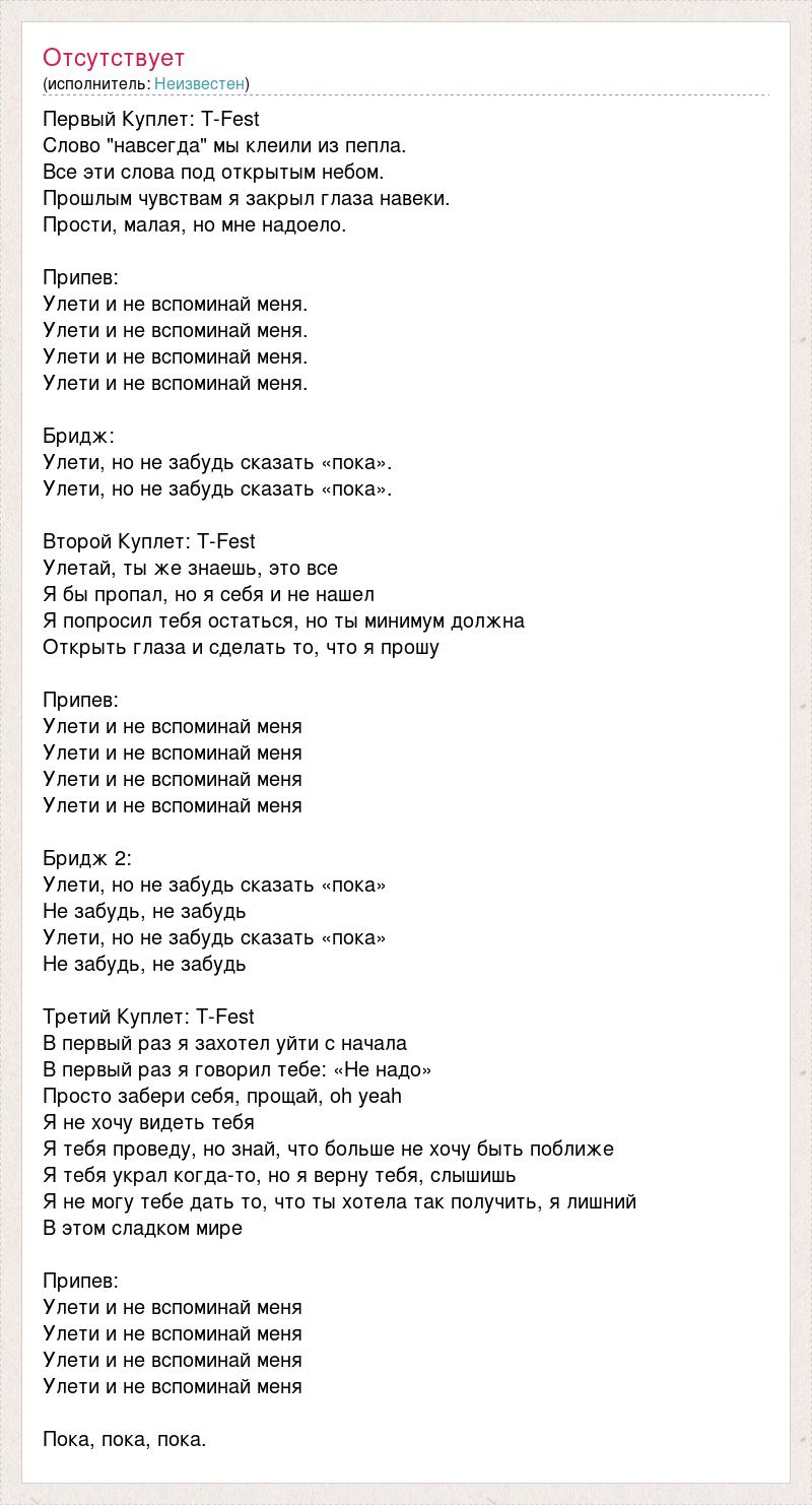 Первый Куплет: T-Fest Слово "навсегда" мы клеили из пепла. Все эти слова под открытым небом. Прошлым чувствам я закрыл глаза навеки. Прости, малая, но мне надоело. Припев: Улети и не вспоминай меня. Улети и не вспоминай меня. Улети и не вспоминай меня. Улети и не вспоминай меня. Бридж: Улети, но не забудь сказать «пока». Улети, но не забудь сказать «пока». Второй Куплет: T-Fest Улетай, ты же знаешь, это все Я бы пропал, но я себя и не нашел Я попросил тебя остаться, но ты минимум должна Открыть глаза и сделать то, что я прошу Припев: Улети и не вспоминай меня Улети и не вспоминай меня Улети и не вспоминай меня Улети и не вспоминай меня Бридж 2: Улети, но не забудь сказать «пока» Не забудь, не забудь Улети, но не забудь сказать «пока» Не забудь, не забудь Третий Куплет: T-Fest В первый раз я захотел уйти с начала В первый раз я говорил тебе: «Не надо» Просто забери себя, прощай, oh yeah Я не хочу видеть тебя Я тебя проведу, но знай, что больше не хочу быть поближе Я тебя украл когда-то, но я верну тебя, слышишь Я не могу тебе дать то, что ты хотела так получить, я лишний В этом сладком мире Припев: Улети и не вспоминай меня Улети и не вспоминай меня Улети и не вспоминай меня Улети и не вспоминай меня Пока, пока, пока.
