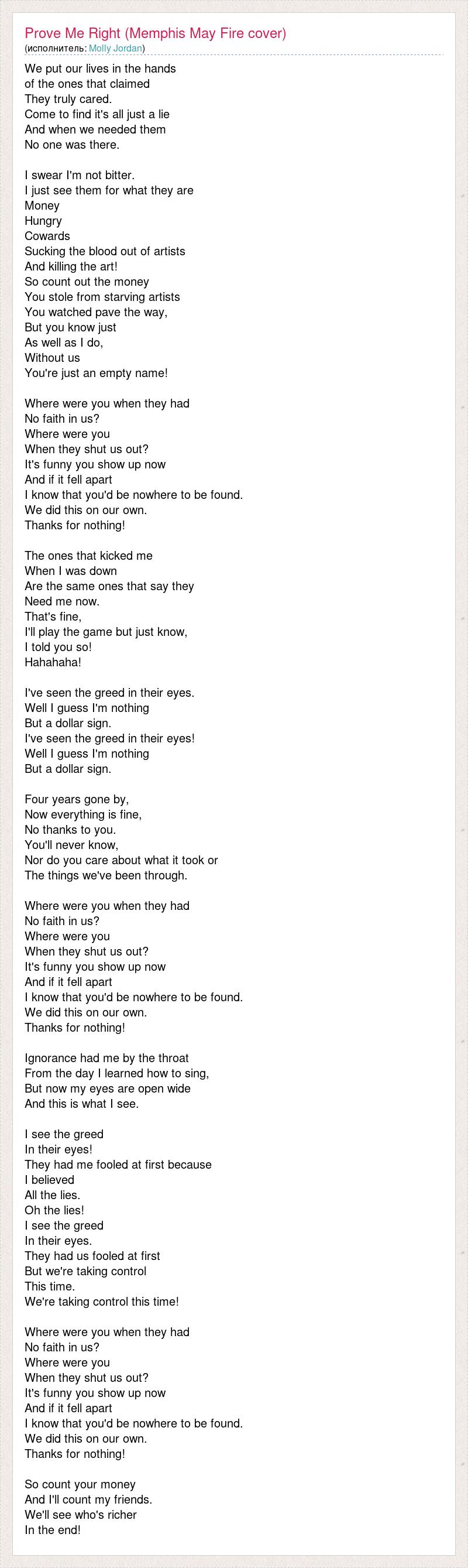 We put our lives in the hands of the ones that claimed They truly cared. Come to find it's all just a lie And when we needed them No one was there. I swear I'm not bitter. I just see them for what they are Money Hungry Cowards Sucking the blood out of artists And killing the art! So count out the money You stole from starving artists You watched pave the way, But you know just As well as I do, Without us You're just an empty name! Where were you when they had No faith in us? Where were you When they shut us out? It's funny you show up now And if it fell apart I know that you'd be nowhere to be found. We did this on our own. Thanks for nothing! The ones that kicked me When I was down Are the same ones that say they Need me now. That's fine, I'll play the game but just know, I told you so! Hahahaha! I've seen the greed in their eyes. Well I guess I'm nothing But a dollar sign. I've seen the greed in their eyes! Well I guess I'm nothing But a dollar sign. Four years gone by, Now everything is fine, No thanks to you. You'll never know, Nor do you care about what it took or The things we've been through. Where were you when they had No faith in us? Where were you When they shut us out? It's funny you show up now And if it fell apart I know that you'd be nowhere to be found. We did this on our own. Thanks for nothing! Ignorance had me by the throat From the day I learned how to sing, But now my eyes are open wide And this is what I see. I see the greed In their eyes! They had me fooled at first because I believed All the lies. Oh the lies! I see the greed In their eyes. They had us fooled at first But we're taking control This time. We're taking control this time! Where were you when they had No faith in us? Where were you When they shut us out? It's funny you show up now And if it fell apart I know that you'd be nowhere to be found. We did this on our own. Thanks for nothing! So count your money And I'll count my friends. We'll see who's richer In the end!
