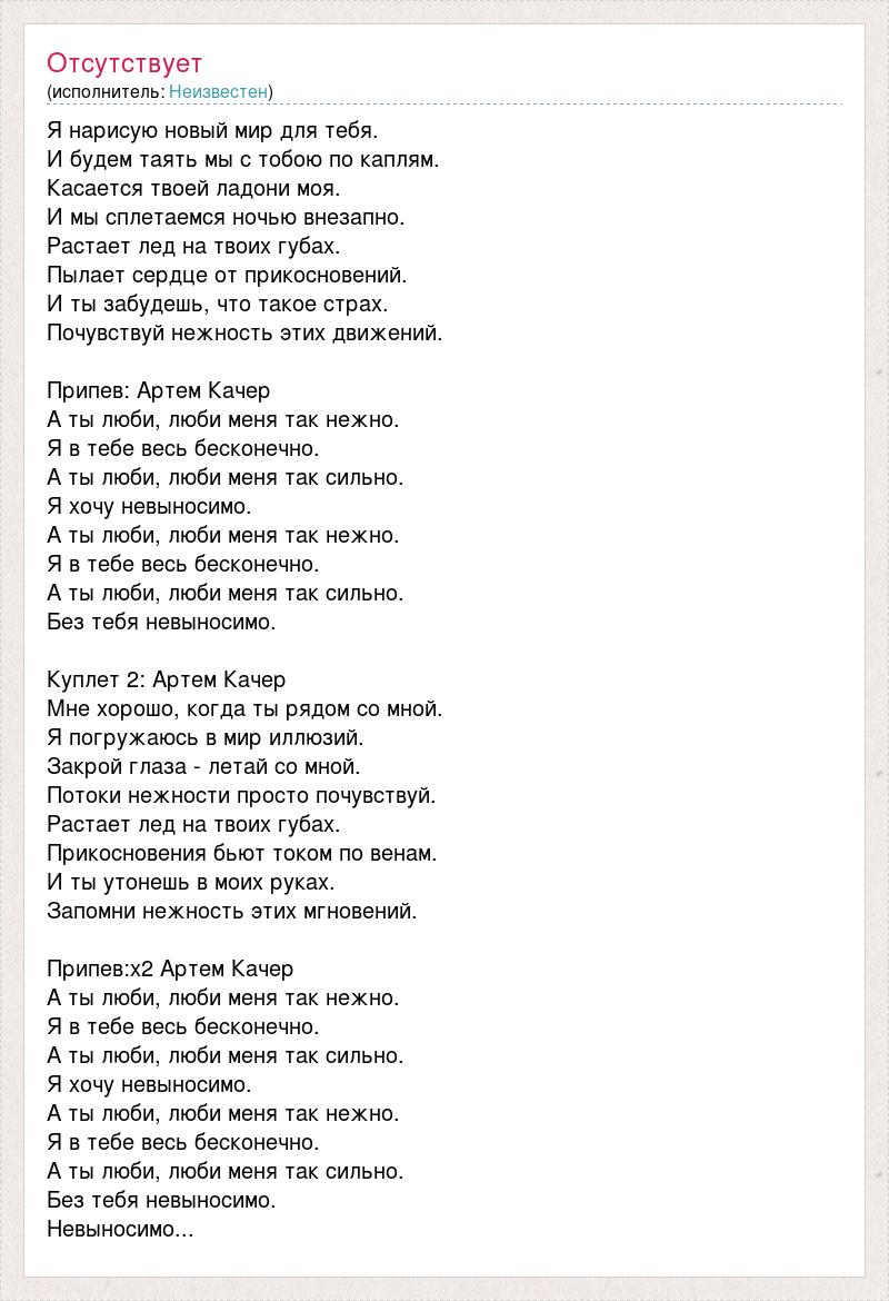 Я нарисую новый мир для тебя. И будем таять мы с тобою по каплям. Касается твоей ладони моя. И мы сплетаемся ночью внезапно. Растает лед на твоих губах. Пылает сердце от прикосновений. И ты забудешь, что такое страх. Почувствуй нежность этих движений. Припев: Артем Качер А ты люби, люби меня так нежно. Я в тебе весь бесконечно. А ты люби, люби меня так сильно. Я хочу невыносимо. А ты люби, люби меня так нежно. Я в тебе весь бесконечно. А ты люби, люби меня так сильно. Без тебя невыносимо. Куплет 2: Артем Качер Мне хорошо, когда ты рядом со мной. Я погружаюсь в мир иллюзий. Закрой глаза - летай со мной. Потоки нежности просто почувствуй. Растает лед на твоих губах. Прикосновения бьют током по венам. И ты утонешь в моих руках. Запомни нежность этих мгновений. Припев:х2 Артем Качер А ты люби, люби меня так нежно. Я в тебе весь бесконечно. А ты люби, люби меня так сильно. Я хочу невыносимо. А ты люби, люби меня так нежно. Я в тебе весь бесконечно. А ты люби, люби меня так сильно. Без тебя невыносимо. Невыносимо...