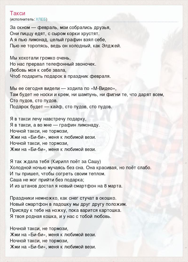За окном — февраль, мои собрались друзья, Они пиццу едят, с сыром корки хрустят. А я пью лимонад, целый графин взял себе, Пью не торопясь, ведь он холодный, как Элджей. Мы хохотали громко очень, Но нас прервал телефонный звоночек. Любовь моя к себе звала, Чтоб подарить подарок в праздник февраля. Мы ее сегодня видели — ходила по «М-Видео», Там будет не носки и крем, ни шампунь, ни фигни те, что дарят всем, Сто пудов, сто пудов. Подарок будет — кайф, сто пудов, сто пудов. Я в такси лечу навстречу подарку, Я в такси, а во мне — графин лимонаду. Ночной такси, не тормози, Жми на «Би-би», меня к любимой вези. Ночной такси, не тормози, Жми на «Би-би», меня к любимой вези. Я так ждала тебя (Кирилл поёт за Сашу) Холодной ночью мучаясь без сна. Она красивая, но поёт слабо. И ты пришел, чтобы согреть своим теплом. Саша не мог прийти без подарка; И из штанов достал я новый смартфон на 8 марта. Праздники немножко, как снег стучат в окошко. Новый смартфон в ладошку мы друг другу положим. Присяду к тебе на ножку, пока варится картошка. Я твоя родная кошка, и у нас с тобой любовь. Ночной такси, не тормози, Жми на «Би-би», меня к любимой вези. Ночной такси, не тормози, Жми на «Би-би», меня к любимой вези.