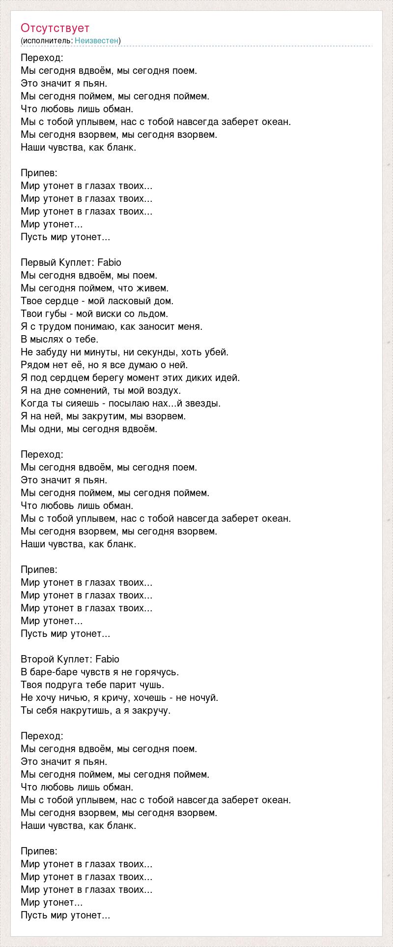 Переход: Мы сегодня вдвоём, мы сегодня поем. Это значит я пьян. Мы сегодня поймем, мы сегодня поймем. Что любовь лишь обман. Мы с тобой уплывем, нас с тобой навсегда заберет океан. Мы сегодня взорвем, мы сегодня взорвем. Наши чувства, как бланк. Припев: Мир утонет в глазах твоих... Мир утонет в глазах твоих... Мир утонет в глазах твоих... Мир утонет... Пусть мир утонет... Первый Куплет: Fabio Мы сегодня вдвоём, мы поем. Мы сегодня поймем, что живем. Твое сердце - мой ласковый дом. Твои губы - мой виски со льдом. Я с трудом понимаю, как заносит меня. В мыслях о тебе. Не забуду ни минуты, ни секунды, хоть убей. Рядом нет её, но я все думаю о ней. Я под сердцем берегу момент этих диких идей. Я на дне сомнений, ты мой воздух. Когда ты сияешь - посылаю нах...й звезды. Я на ней, мы закрутим, мы взорвем. Мы одни, мы сегодня вдвоём. Переход: Мы сегодня вдвоём, мы сегодня поем. Это значит я пьян. Мы сегодня поймем, мы сегодня поймем. Что любовь лишь обман. Мы с тобой уплывем, нас с тобой навсегда заберет океан. Мы сегодня взорвем, мы сегодня взорвем. Наши чувства, как бланк. Припев: Мир утонет в глазах твоих... Мир утонет в глазах твоих... Мир утонет в глазах твоих... Мир утонет... Пусть мир утонет... Второй Куплет: Fabio В баре-баре чувств я не горячусь. Твоя подруга тебе парит чушь. Не хочу ничью, я кричу, хочешь - не ночуй. Ты себя накрутишь, а я закручу. Переход: Мы сегодня вдвоём, мы сегодня поем. Это значит я пьян. Мы сегодня поймем, мы сегодня поймем. Что любовь лишь обман. Мы с тобой уплывем, нас с тобой навсегда заберет океан. Мы сегодня взорвем, мы сегодня взорвем. Наши чувства, как бланк. Припев: Мир утонет в глазах твоих... Мир утонет в глазах твоих... Мир утонет в глазах твоих... Мир утонет... Пусть мир утонет...