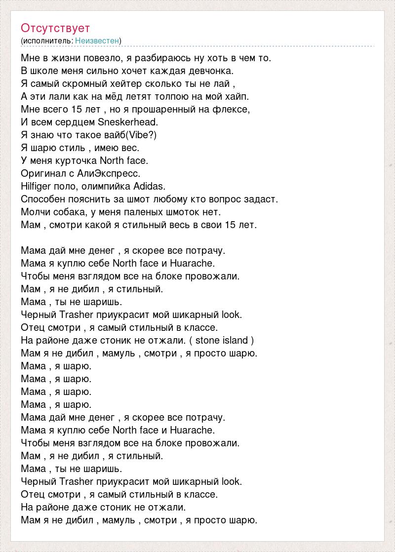 Мне в жизни повезло, я разбираюсь ну хоть в чем то. В школе меня сильно хочет каждая девчонка. Я самый скромный хейтер сколько ты не лай , А эти лали как на мёд летят толпою на мой хайп. Мне всего 15 лет , но я прошаренный на флексе, И всем сердцем Sneskerhead. Я знаю что такое вайб(Vibe?) Я шарю стиль , имею вес. У меня курточка North face. Оригинал с АлиЭкспресс. Hilfiger поло, олимпийка Adidas. Способен пояснить за шмот любому кто вопрос задаст. Молчи собака, у меня паленых шмоток нет. Мам , смотри какой я стильный весь в свои 15 лет. Мама дай мне денег , я скорее все потрачу. Мама я куплю себе North face и Huarache. Чтобы меня взглядом все на блоке провожали. Мам , я не дибил , я стильный. Мама , ты не шаришь. Черный Trasher приукрасит мой шикарный look. Отец смотри , я самый стильный в классе. На районе даже стоник не отжали. ( stone island ) Мам я не дибил , мамуль , смотри , я просто шарю. Мама , я шарю. Мама , я шарю. Мама , я шарю. Мама , я шарю. Мама дай мне денег , я скорее все потрачу. Мама я куплю себе North face и Huarache. Чтобы меня взглядом все на блоке провожали. Мам , я не дибил , я стильный. Мама , ты не шаришь. Черный Trasher приукрасит мой шикарный look. Отец смотри , я самый стильный в классе. На районе даже стоник не отжали. Мам я не дибил , мамуль , смотри , я просто шарю.