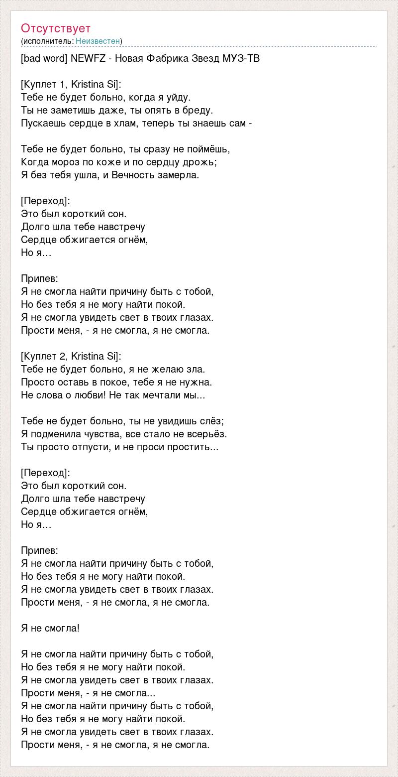 [bad word] NEWFZ - Новая Фабрика Звезд МУЗ-ТВ [Куплет 1, Kristina Si]: Тебе не будет больно, когда я уйду. Ты не заметишь даже, ты опять в бреду. Пускаешь сердце в хлам, теперь ты знаешь сам - Тебе не будет больно, ты сразу не поймёшь, Когда мороз по коже и по сердцу дрожь; Я без тебя ушла, и Вечность замерла. [Переход]: Это был короткий сон. Долго шла тебе навстречу Сердце обжигается огнём, Но я… Припев: Я не смогла найти причину быть с тобой, Но без тебя я не могу найти покой. Я не смогла увидеть свет в твоих глазах. Прости меня, - я не смогла, я не смогла. [Куплет 2, Kristina Si]: Тебе не будет больно, я не желаю зла. Просто оставь в покое, тебе я не нужна. Не слова о любви! Не так мечтали мы... Тебе не будет больно, ты не увидишь слёз; Я подменила чувства, все стало не всерьёз. Ты просто отпусти, и не проси простить... [Переход]: Это был короткий сон. Долго шла тебе навстречу Сердце обжигается огнём, Но я… Припев: Я не смогла найти причину быть с тобой, Но без тебя я не могу найти покой. Я не смогла увидеть свет в твоих глазах. Прости меня, - я не смогла, я не смогла. Я не смогла! Я не смогла найти причину быть с тобой, Но без тебя я не могу найти покой. Я не смогла увидеть свет в твоих глазах. Прости меня, - я не смогла... Я не смогла найти причину быть с тобой, Но без тебя я не могу найти покой. Я не смогла увидеть свет в твоих глазах. Прости меня, - я не смогла, я не смогла.