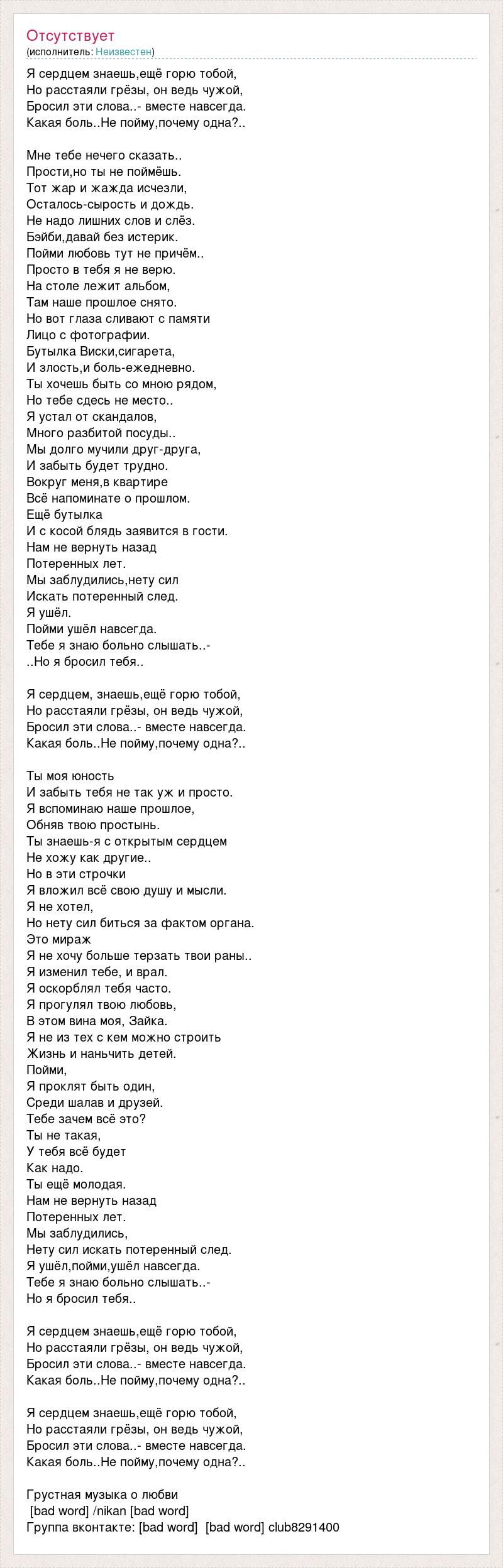 Я сердцем знаешь,ещё горю тобой, Но расстаяли грёзы, он ведь чужой, Бросил эти слова..- вместе навсегда. Какая боль..Не пойму,почему одна?.. Мне тебе нечего сказать.. Прости,но ты не поймёшь. Тот жар и жажда исчезли, Осталось-сырость и дождь. Не надо лишних слов и слёз. Бэйби,давай без истерик. Пойми любовь тут не причём.. Просто в тебя я не верю. На столе лежит альбом, Там наше прошлое снято. Но вот глаза сливают с памяти Лицо с фотографии. Бутылка Виски,сигарета, И злость,и боль-ежедневно. Ты хочешь быть со мною рядом, Но тебе сдесь не место.. Я устал от скандалов, Много разбитой посуды.. Мы долго мучили друг-друга, И забыть будет трудно. Вокруг меня,в квартире Всё напоминате о прошлом. Ещё бутылка И с косой блядь заявится в гости. Нам не вернуть назад Потеренных лет. Мы заблудились,нету сил Искать потеренный след. Я ушёл. Пойми ушёл навсегда. Тебе я знаю больно слышать..- ..Но я бросил тебя.. Я сердцем, знаешь,ещё горю тобой, Но расстаяли грёзы, он ведь чужой, Бросил эти слова..- вместе навсегда. Какая боль..Не пойму,почему одна?.. Ты моя юность И забыть тебя не так уж и просто. Я вспоминаю наше прошлое, Обняв твою простынь. Ты знаешь-я с открытым сердцем Не хожу как другие.. Но в эти строчки Я вложил всё свою душу и мысли. Я не хотел, Но нету сил биться за фактом органа. Это мираж Я не хочу больше терзать твои раны.. Я изменил тебе, и врал. Я оскорблял тебя часто. Я прогулял твою любовь, В этом вина моя, Зайка. Я не из тех с кем можно строить Жизнь и наньчить детей. Пойми, Я проклят быть один, Среди шалав и друзей. Тебе зачем всё это? Ты не такая, У тебя всё будет Как надо. Ты ещё молодая. Нам не вернуть назад Потеренных лет. Мы заблудились, Нету сил искать потеренный след. Я ушёл,пойми,ушёл навсегда. Тебе я знаю больно слышать..- Но я бросил тебя.. Я сердцем знаешь,ещё горю тобой, Но расстаяли грёзы, он ведь чужой, Бросил эти слова..- вместе навсегда. Какая боль..Не пойму,почему одна?.. Я сердцем знаешь,ещё горю тобой, Но расстаяли грёзы, он ведь чужой, Бросил эти слова..- вместе навсегда. Какая боль..Не пойму,почему одна?.. Грустная музыка о любви [bad word] /nikan [bad word] Группа вконтакте: [bad word] [bad word] club8291400