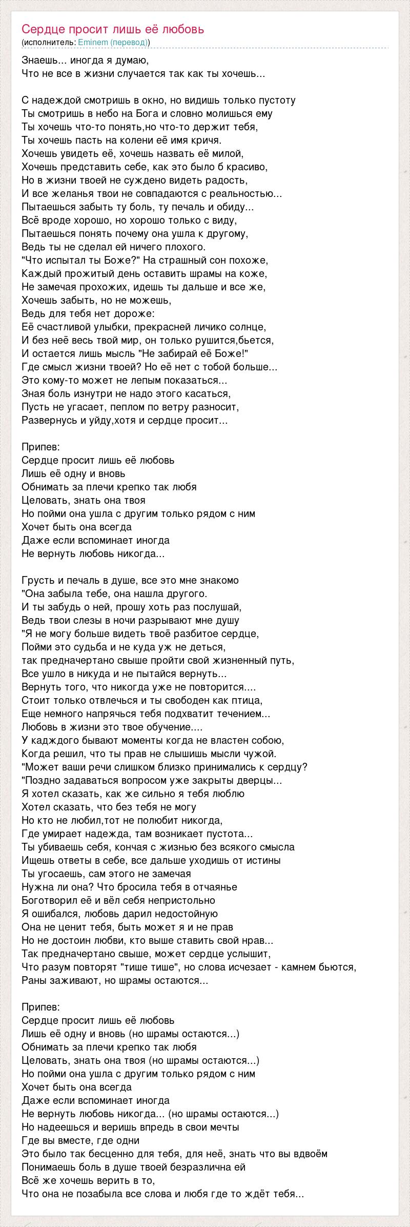 Знаешь... иногда я думаю, Что не все в жизни случается так как ты хочешь... С надеждой смотришь в окно, но видишь только пустоту Ты смотришь в небо на Бога и словно молишься ему Ты хочешь что-то понять,но что-то держит тебя, Ты хочешь пасть на колени её имя кричя. Хочешь увидеть её, хочешь назвать её милой, Хочешь представить себе, как это было б красиво, Но в жизни твоей не суждено видеть радость, И все желанья твои не совпадаются с реальностью... Пытаешься забыть ту боль, ту печаль и обиду... Всё вроде хорошо, но хорошо только с виду, Пытаешься понять почему она ушла к другому, Ведь ты не сделал ей ничего плохого. "Что испытал ты Боже?" На страшный сон похоже, Каждый прожитый день оставить шрамы на коже, Не замечая прохожих, идешь ты дальше и все же, Хочешь забыть, но не можешь, Ведь для тебя нет дороже: Её счастливой улыбки, прекрасней личико солнце, И без неё весь твой мир, он только рушится,бьется, И остается лишь мысль "Не забирай её Боже!" Где смысл жизни твоей? Но её нет с тобой больше... Это кому-то может не лепым показаться... Зная боль изнутри не надо этого касаться, Пусть не угасает, пеплом по ветру разносит, Развернусь и уйду,хотя и сердце просит... Припев: Сердце просит лишь её любовь Лишь её одну и вновь Обнимать за плечи крепко так любя Целовать, знать она твоя Но пойми она ушла с другим только рядом с ним Хочет быть она всегда Даже если вспоминает иногда Не вернуть любовь никогда... Грусть и печаль в душе, все это мне знакомо "Она забыла тебе, она нашла другого. И ты забудь о ней, прошу хоть раз послушай, Ведь твои слезы в ночи разрывают мне душу "Я не могу больше видеть твоё разбитое сердце, Пойми это судьба и не куда уж не деться, так предначертано свыше пройти свой жизненный путь, Все ушло в никуда и не пытайся вернуть... Вернуть того, что никогда уже не повторится.... Стоит только отвлечься и ты свободен как птица, Еще немного напрячься тебя подхватит течением... Любовь в жизни это твое обучение.... У кадждого бывают моменты когда не властен собою, Когда решил, что ты прав не слышишь мысли чужой. "Может ваши речи слишком близко принимались к сердцу? "Поздно задаваться вопросом уже закрыты дверцы... Я хотел сказать, как же сильно я тебя люблю Хотел сказать, что без тебя не могу Но кто не любил,тот не полюбит никогда, Где умирает надежда, там возникает пустота... Ты убиваешь себя, кончая с жизнью без всякого смысла Ищешь ответы в себе, все дальше уходишь от истины Ты угосаешь, сам этого не замечая Нужна ли она? Что бросила тебя в отчаянье Боготворил её и вёл себя непристольно Я ошибался, любовь дарил недостойную Она не ценит тебя, быть может я и не прав Но не достоин любви, кто выше ставить свой нрав... Так предначертано свыше, может сердце услышит, Что разум повторят "тише тише", но слова исчезает - камнем бьются, Раны заживают, но шрамы остаются... Припев: Сердце просит лишь её любовь Лишь её одну и вновь (но шрамы остаются...) Обнимать за плечи крепко так любя Целовать, знать она твоя (но шрамы остаются...) Но пойми она ушла с другим только рядом с ним Хочет быть она всегда Даже если вспоминает иногда Не вернуть любовь никогда... (но шрамы остаются...) Но надеешься и веришь впредь в свои мечты Где вы вместе, где одни Это было так бесценно для тебя, для неё, знать что вы вдвоём Понимаешь боль в душе твоей безразлична ей Всё же хочешь верить в то, Что она не позабыла все слова и любя г