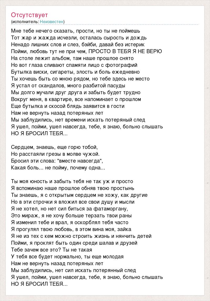 Мне тебе нечего сказать, прости, но ты не поймешь Тот жар и жажда исчезли, осталась сырость и дождь Ненадо лишних слов и слез, бэйби, давай без истерик Пойми, любовь тут не при чем, ПРОСТО В ТЕБЯ Я НЕ ВЕРЮ На столе лежит альбом, там наше прошлое снято Но вот глаза сливают спамяти лицо с фотографий Бутылка виски, сигареты, злость и боль ежедневно Ты хочешь быть со мною рядом, но тебе здесь не место Я устал от скандалов, много разбитой пасуды Мы долго мучали друг друга и забыть будет трудно Вокруг меня, в квартире, все напоминает о прошлом Еще бутылка и скосой блядь заявится в гости Нам не вернуть назад потеряных лет Мы заблудились, нет времени искать потеряный след Я ушел, пойми, ушел навсегда, тебе, я знаю, больно слышать НО Я БРОСИЛ ТЕБЯ... Сердцем, знаешь, еще горю тобой, Но расстаяли грезы в молве чужой. Бросил эти слова: "вместе навсегда", Какая боль... не пойму, почему одна... Ты моя юность и забыть тебя не так уж и просто Я вспоминаю наше прошлое обняв твою простынь Ты знаешь, я с открытым сердцем не хожу, как другие Но в эти строчки я вложил все свои душу и мысли Я не хотел, но нет сил биться за фатаморгану, Это мираж, я не хочу больше терзать твои раны Я изменил тебе и врал, я оскорблял тебя часто Я прогулял твою любовь, в этом вина моя, зайка Я не из тех с кем можно строить жизнь и нянчить детей Пойми, я проклят быть один среди шалав и друзей Тебе зачем все это? Ты не такая У тебя все будет нормально, ты еще молодая Нам не вернуть назад потеряных лет Мы заблудились, нет сил искать потерянный след Я ушел, пойми, ушел навсегда, тебе, я знаю, больно слышать НО Я БРОСИЛ ТЕБЯ...