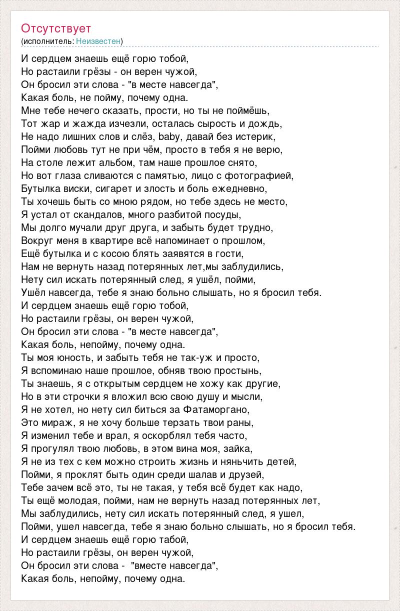 И сердцем знаешь ещё горю тобой, Но растаили грёзы - он верен чужой, Он бросил эти слова - "в месте навсегда", Какая боль, не пойму, почему одна. Мне тебе нечего сказать, прости, но ты не поймёшь, Тот жар и жажда изчезли, осталась сырость и дождь, Не надо лишних слов и слёз, baby, давай без истерик, Пойми любовь тут не при чём, просто в тебя я не верю, На столе лежит альбом, там наше прошлое снято, Но вот глаза сливаются с памятью, лицо с фотографией, Бутылка виски, сигарет и злость и боль ежедневно, Ты хочешь быть со мною рядом, но тебе здесь не место, Я устал от скандалов, много разбитой посуды, Мы долго мучали друг друга, и забыть будет трудно, Вокруг меня в квартире всё напоминает о прошлом, Ещё бутылка и с косою блять заявятся в гости, Нам не вернуть назад потерянных лет,мы заблудились, Нету сил искать потерянный след, я ушёл, пойми, Ушёл навсегда, тебе я знаю больно слышать, но я бросил тебя. И сердцем знаешь ещё горю тобой, Но растаили грёзы, он верен чужой, Он бросил эти слова - "в месте навсегда", Какая боль, непойму, почему одна. Ты моя юность, и забыть тебя не так-уж и просто, Я вспоминаю наше прошлое, обняв твою простынь, Ты знаешь, я с открытым сердцем не хожу как другие, Но в эти строчки я вложил всю свою душу и мысли, Я не хотел, но нету сил биться за Фатаморгано, Это мираж, я не хочу больше терзать твои раны, Я изменил тебе и врал, я оскорблял тебя часто, Я прогулял твою любовь, в этом вина моя, зайка, Я не из тех с кем можно строить жизнь и няньчить детей, Пойми, я проклят быть один среди шалав и друзей, Тебе зачем всё это, ты не такая, у тебя всё будет как надо, Ты ещё молодая, пойми, нам не вернуть назад потерянных лет, Мы заблудились, нету сил искать потерянный след, я ушел, Пойми, ушел навсегда, тебе я знаю больно слышать, но я бросил тебя. И сердцем знаешь ещё горю табой, Но растаили грёзы, он верен чужой, Он бросил эти слова - "вместе навсегда", Какая боль, непойму, почему одна.