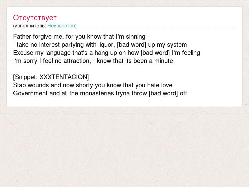 Father forgive me, for you know that I'm sinning I take no interest partying with liquor, [bad word] up my system Excuse my language that's a hang up on how [bad word] I'm feeling I'm sorry I feel no attraction, I know that its been a minute [Snippet: XXXTENTACION] Stab wounds and now shorty you know that you hate love Government and all the monasteries tryna throw [bad word] off