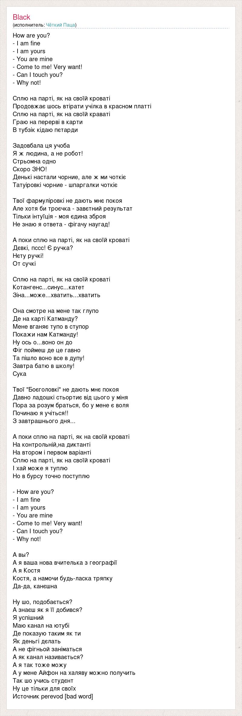 How are you? - I am fine - I am yours - You are mine - Come to me! Very want! - Can I touch you? - Why not! Сплю на парті, як на своїй кроваті Продовжає шось втірати учілка в красном платті Сплю на парті, як на своїй краваті Граю на перерві в карти В тубзік кідаю пєтарди Задовбала ця учоба Я ж людина, а не робот! Стрьомна одно Скоро ЗНО! Денькі настали чорние, але ж ми чоткіє Татуіровкі чорние - шпаргалки чоткіє Твої фармуліровкі не дають мнє покоя Але хотя би троєчка - завєтний результат Тільки інтуїція - моя єдина зброя Не знаю я ответа - фігачу наугад! А поки сплю на парті, як на своїй кроваті Дєвкі, пссс! Є ручка? Нєту ручкі! От сучкі Сплю на парті, як на своїй кроваті Котангенс...синус...катет Зіна...може...хватить...хватить Она смотре на мене так глупо Де на карті Катманду? Мене вганяє тупо в ступор Покажи нам Катманду! Ну ось о...воно он до Фіг поймеш де це гавно Та пішло воно все в дупу! Завтра батю в школу! Сука Твої "Боєголовкі" не дають мнє покоя Давно ладошкі стьортиє від цього у міня Пора за розум браться, бо у мене є воля Починаю я учіться!! З завтрашнього дня... А поки сплю на парті, як на своїй кроваті На контрольній,на диктанті На втором і первом варіанті Сплю на парті, як на своїй кроваті І хай може я туплю Но в бурсу точно поступлю - How are you? - I am fine - I am yours - You are mine - Come to me! Very want! - Can I touch you? - Why not! А вы? А я ваша нова вчителька з географії А я Костя Костя, а намочи будь-ласка тряпку Да-да, канєшна Ну шо, подобається? А знаєш як я її добився? Я успішний Маю канал на ютубі Де показую таким як ти Як деньгі дєлать А не фігньой заніматься А як канал називається? А я так тоже можу А у мене Айфон на халяву можно получить Так шо учись студєнт Ну це тільки для своїх Источник perevod [bad word]